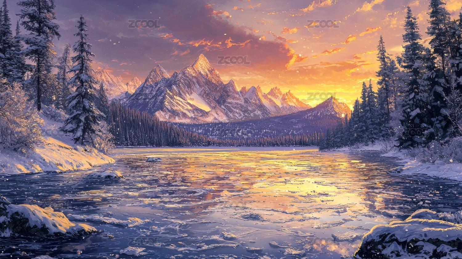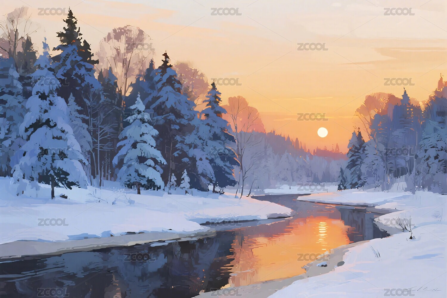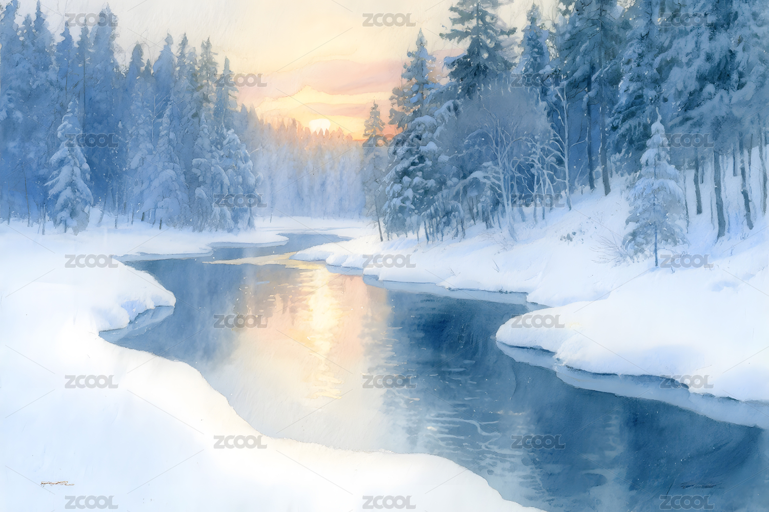 雪景,河流,树木,夕阳,冬日,风景,自然,山水,森林,雪地