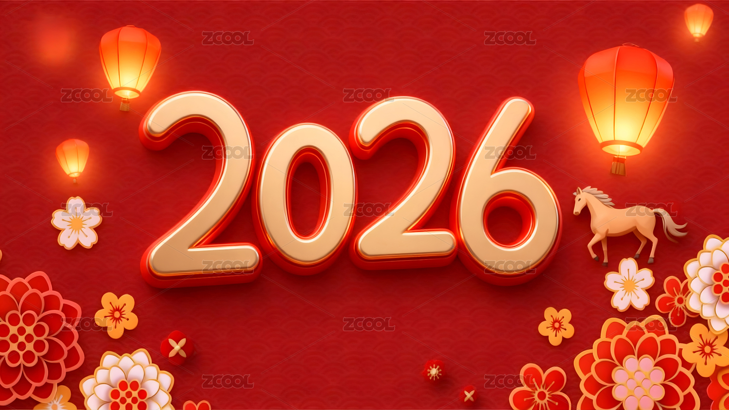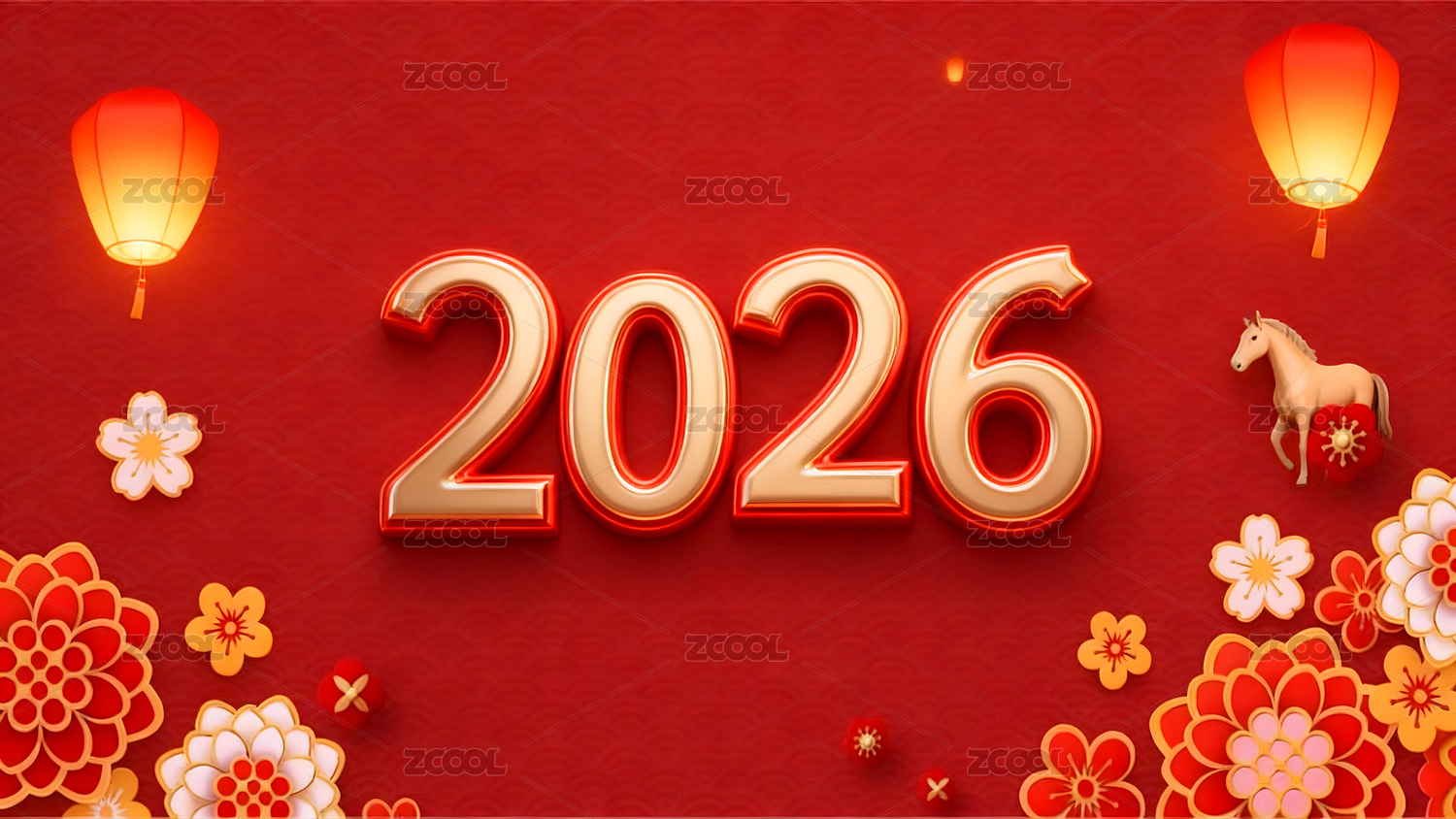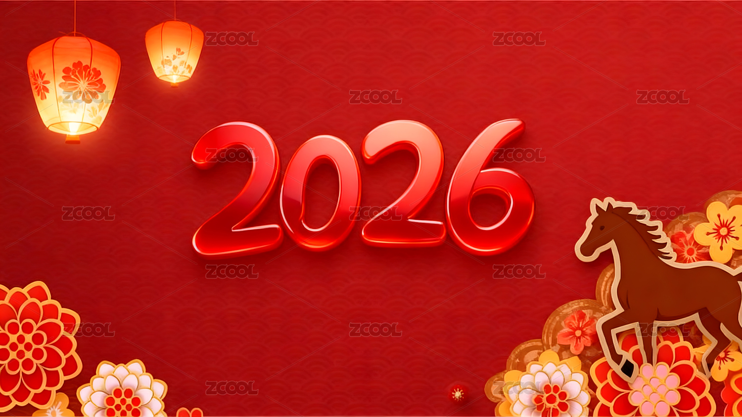 2026,新年,烟花,骏马,红色,背景,灯笼,中国结,花朵,喜庆