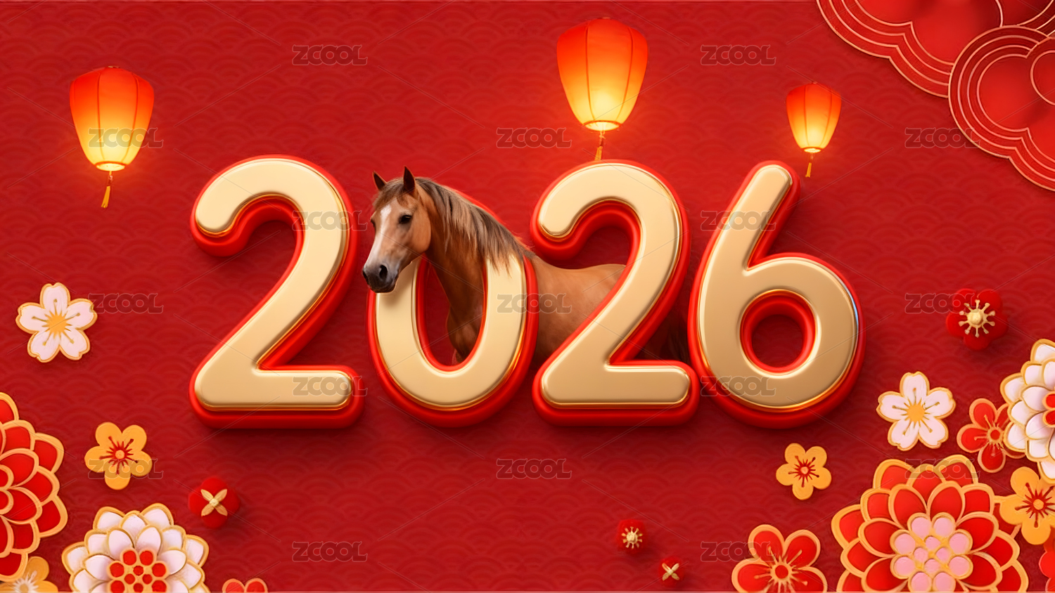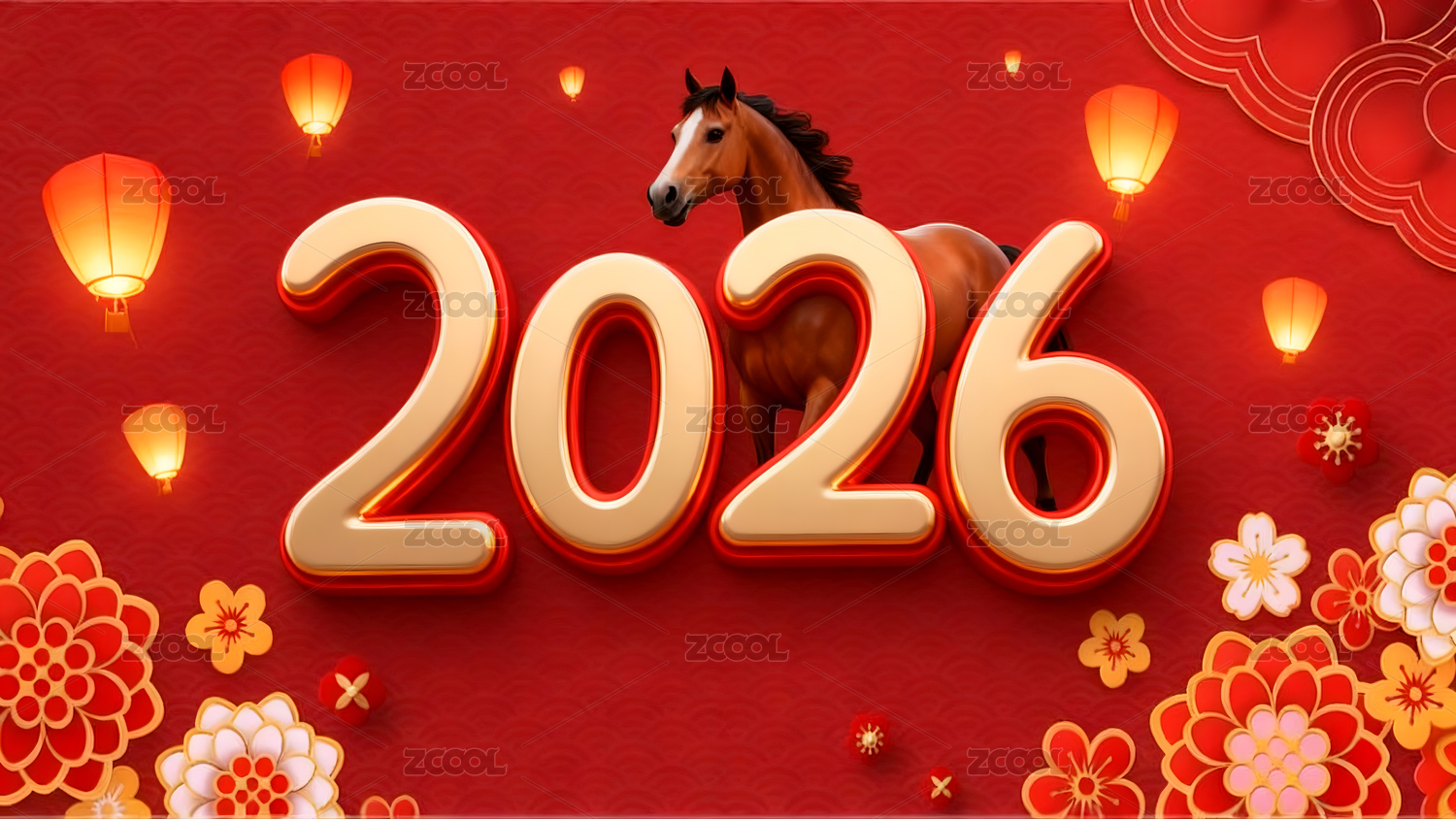 2026,新年,烟花,骏马,红色,背景,灯笼,中国结,花朵,喜庆