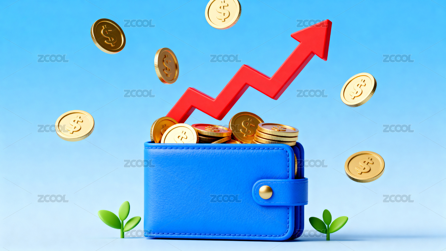 蓝色钱包金币飞溅箭头上升象征财富增长