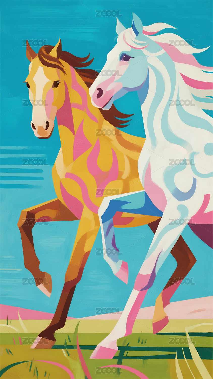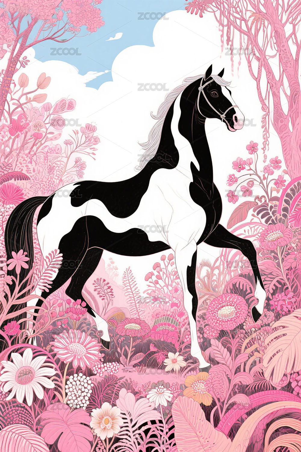 骏马,花朵,鲜艳,蓝天,奇幻,多彩,缰绳,站立,森林,花海