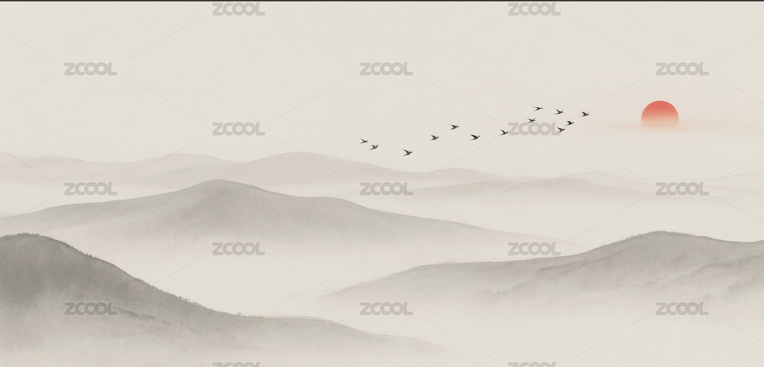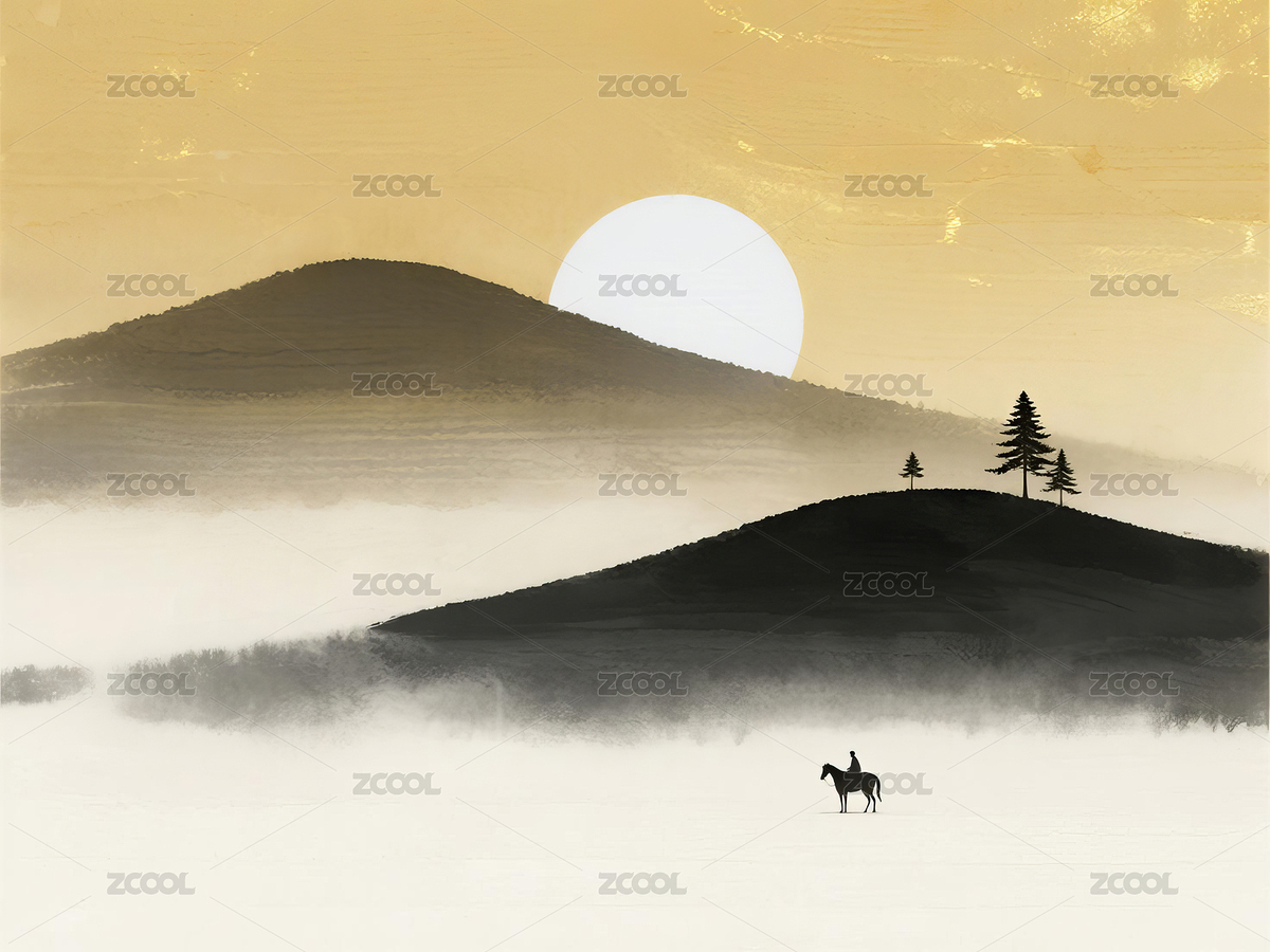 国风,国画,阳光,金色,行人,骑马,山脉,暖色,树木,极简