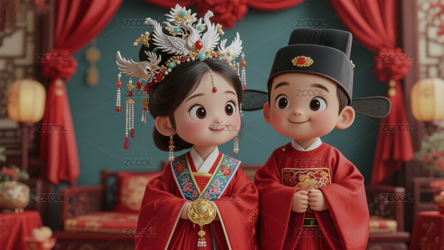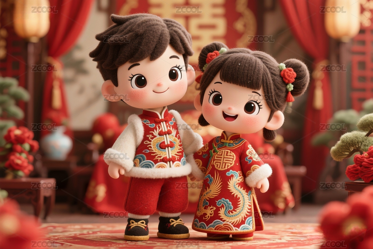 人偶,男孩,女孩,喜事,拜堂,龙凤褂,场景,红色调,牵手,复古