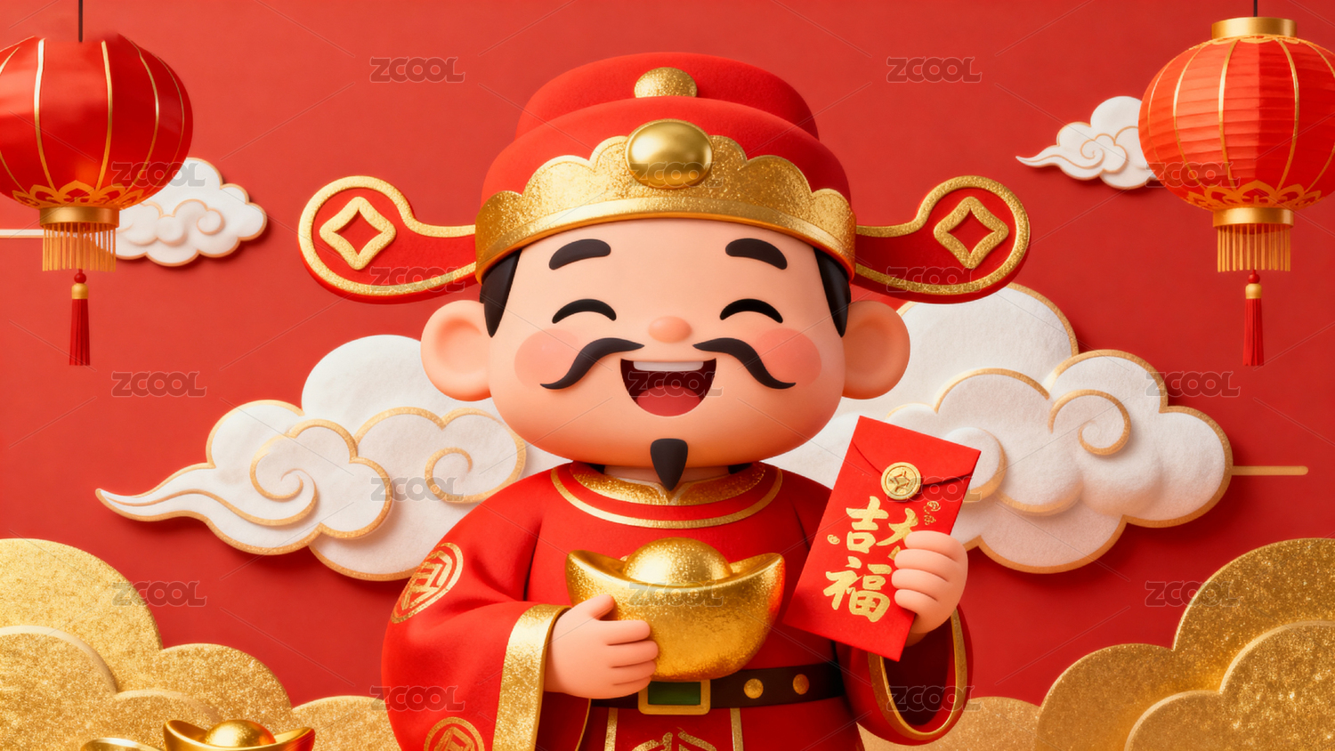 红色背景财神卡通形象寓意吉祥