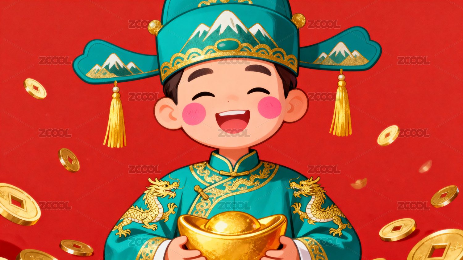 财神,金元宝,铜钱,笑脸,金币,娃娃,红衣,花帽,云纹,流苏