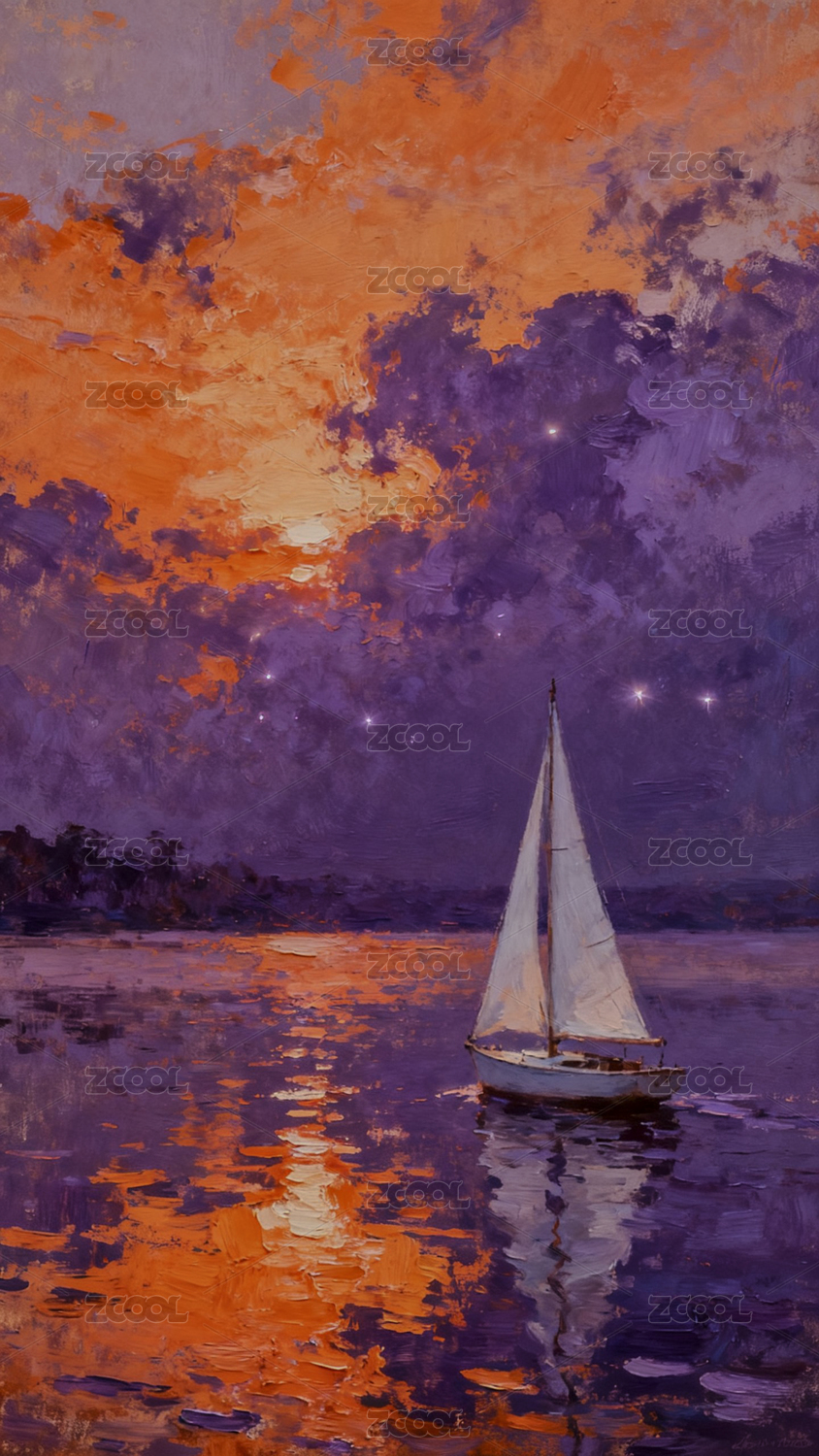 帆船,日落,海洋,油彩,笔触,橙红,天际,岛屿,波光,倒影