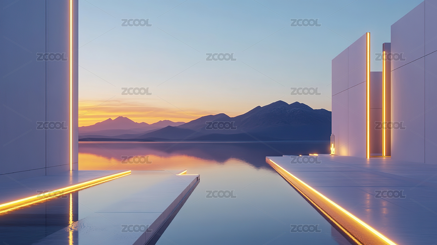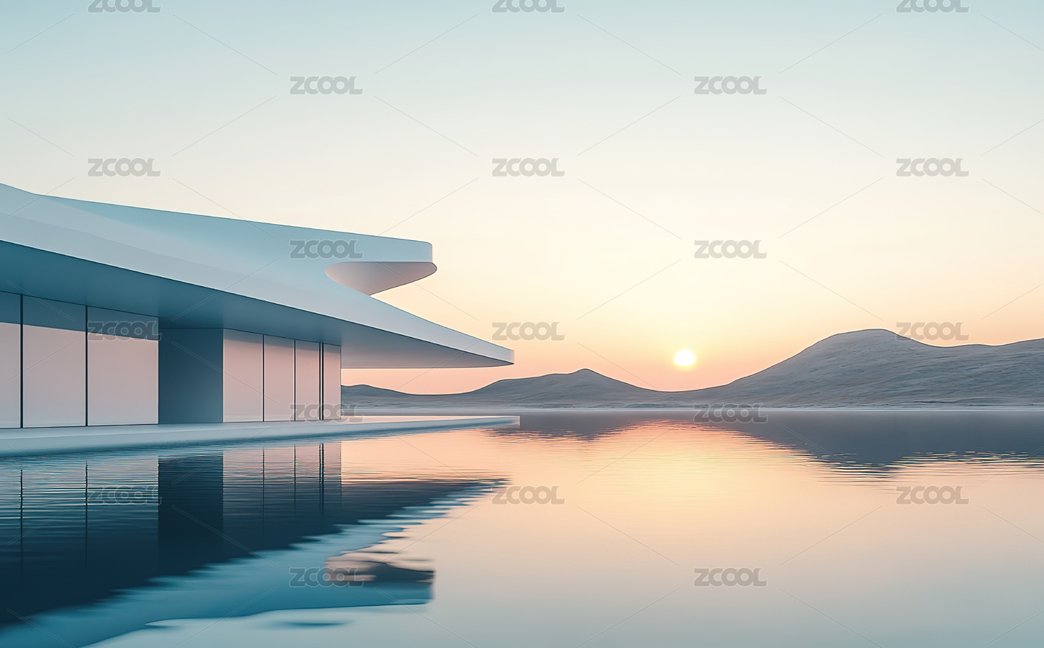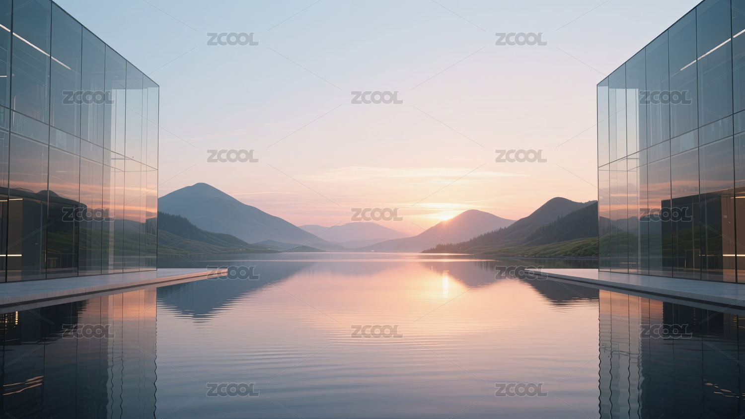 山脉,水面,宁静,建筑,玻璃,反射,天空,地平线,日出,现代