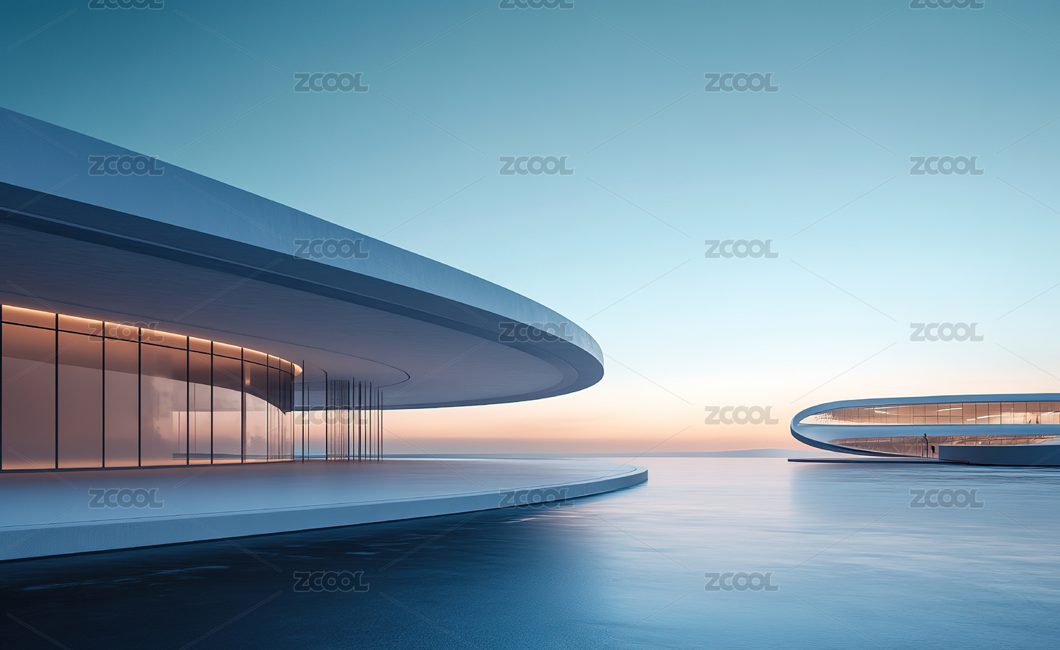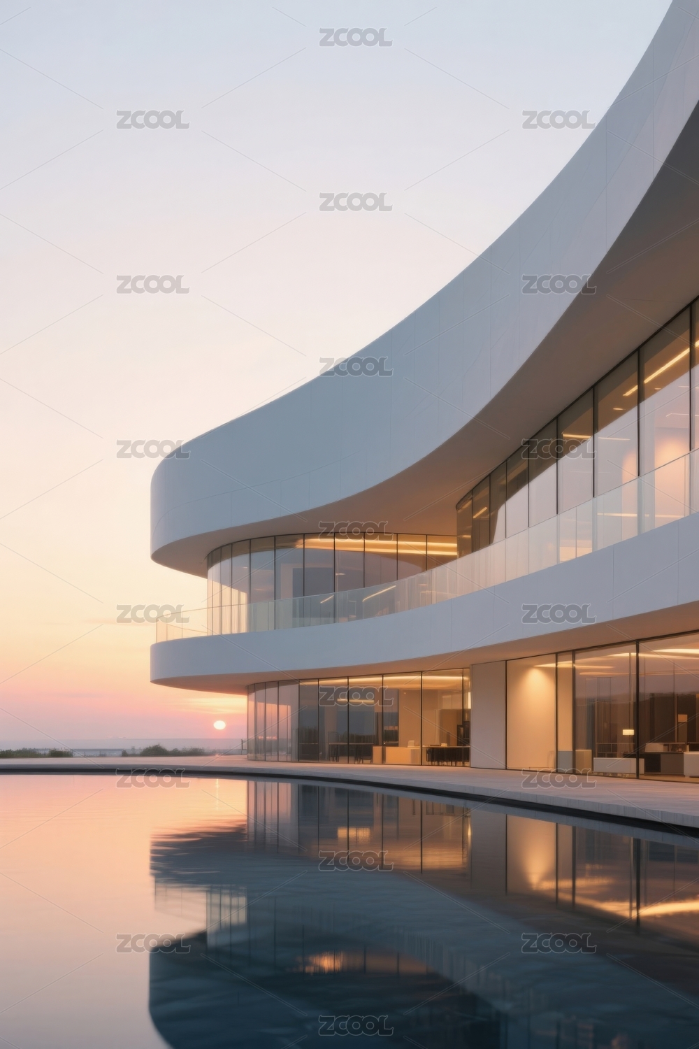 水面,倒影,建筑,玻璃,反射,天空,白色,曲线,现代,日落