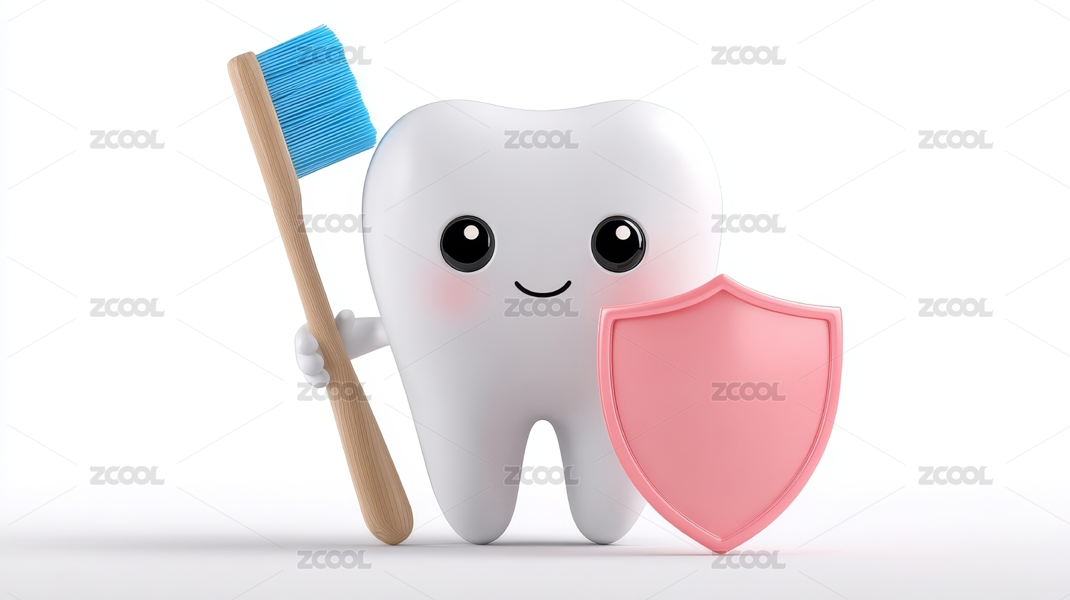 一颗拟人卡通牙齿拿着牙刷笑3D渲染模型