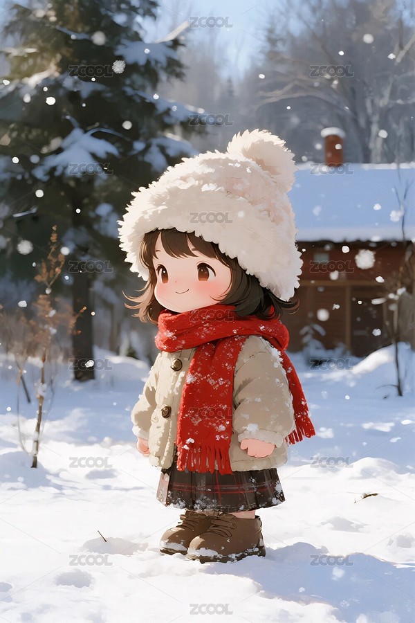小女孩,雪地,冬季,插画,矢量,卡通,可爱,白色帽子,红色围巾,树木