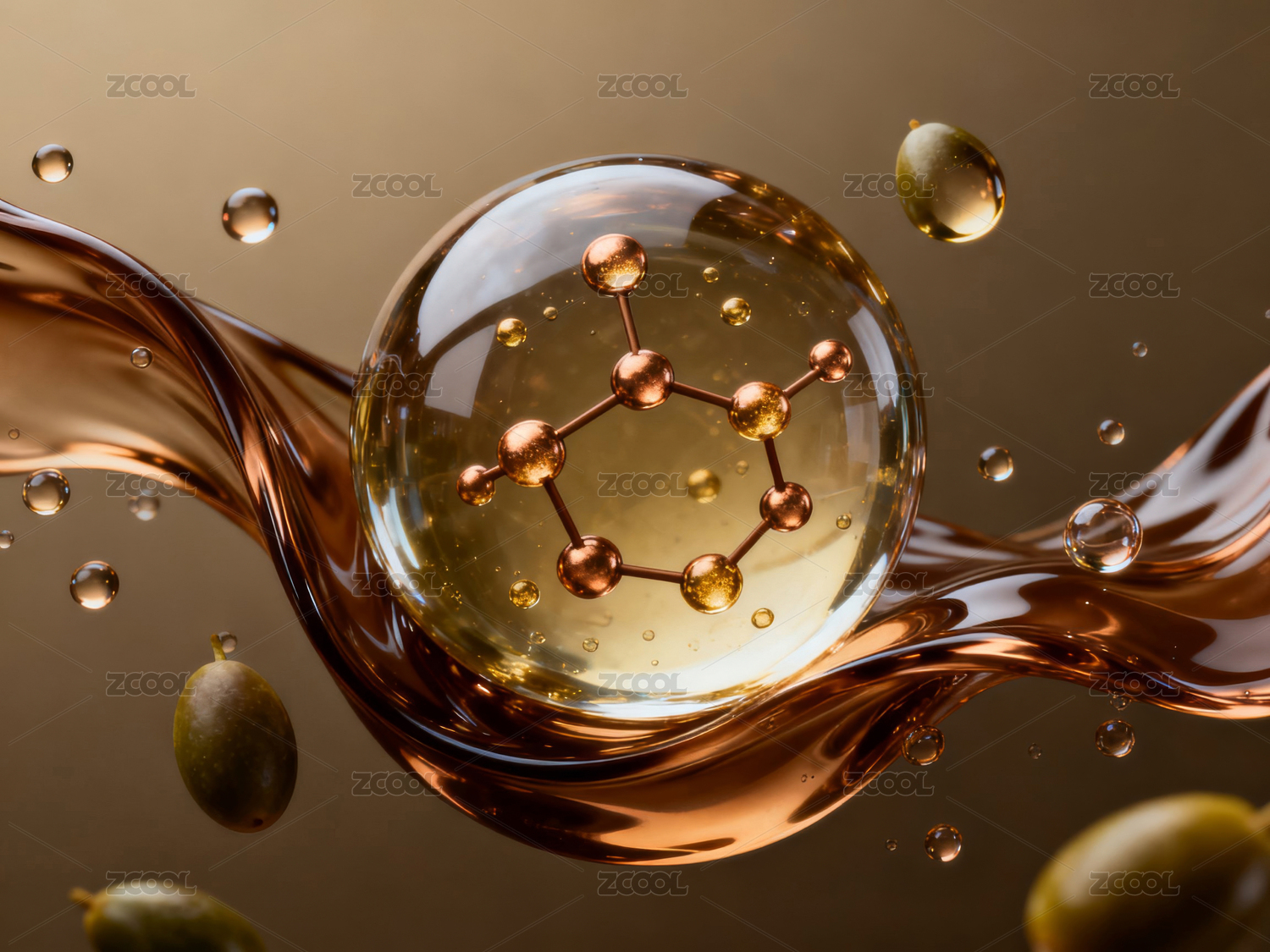 分子结构与金色液体的融合