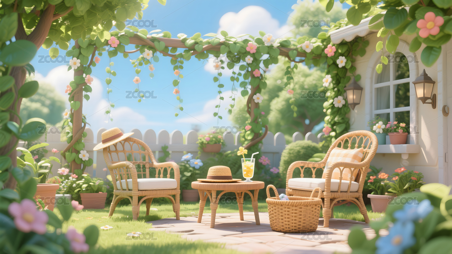 蓝天,阳光,花园,花朵,绿草,蝴蝶,紫藤,凉亭,向日葵,蛋糕