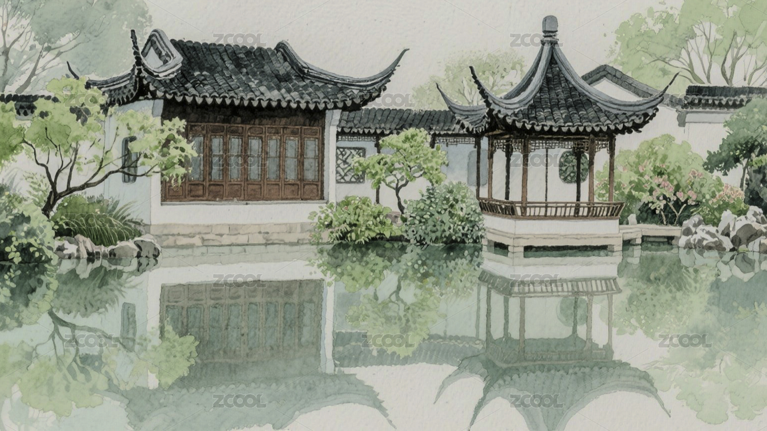 建筑,园林,仙鹤,古亭,池塘,荷花,倒影,雾气,柳树,凉亭