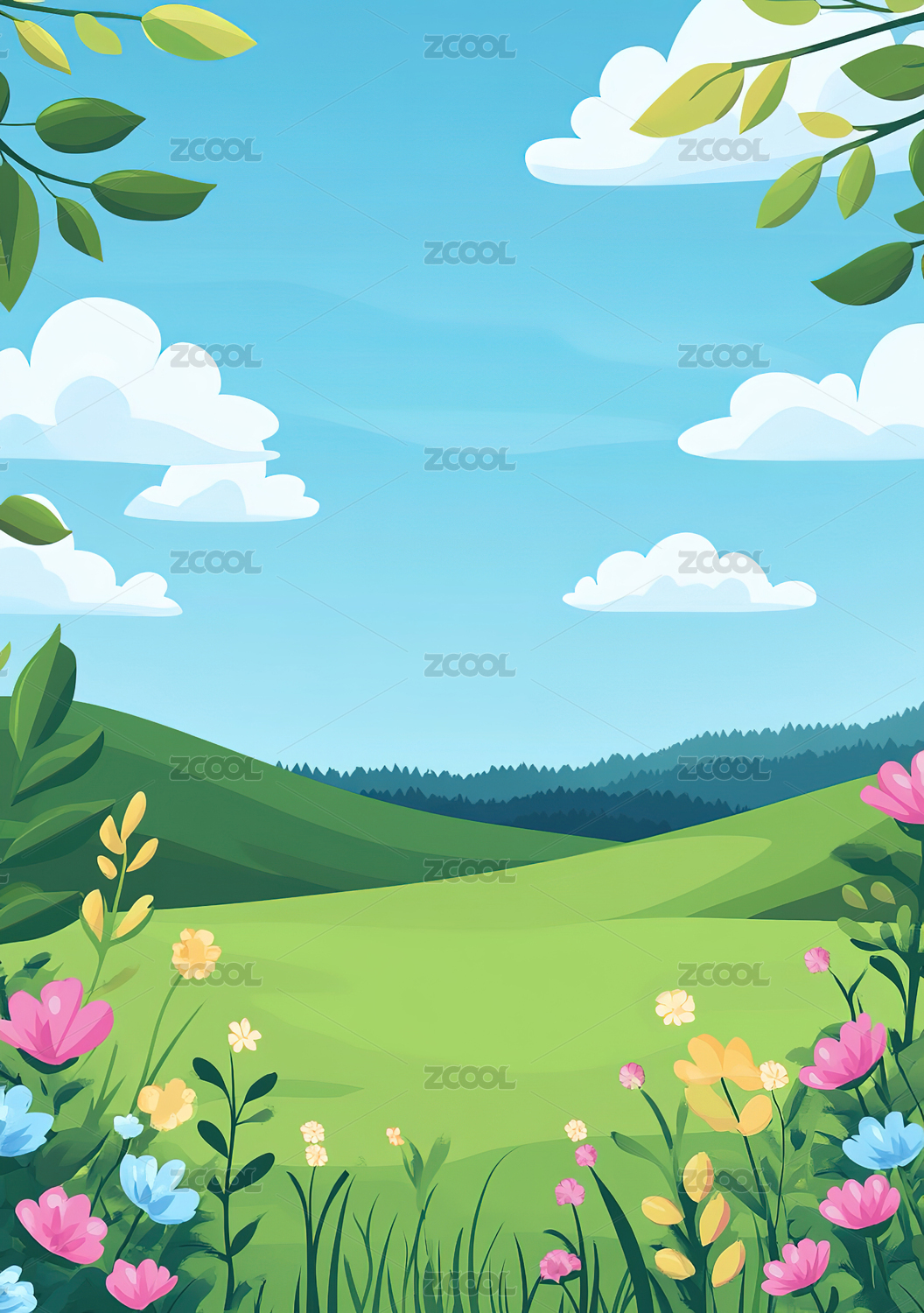 春天蓝天草地风景手绘插画