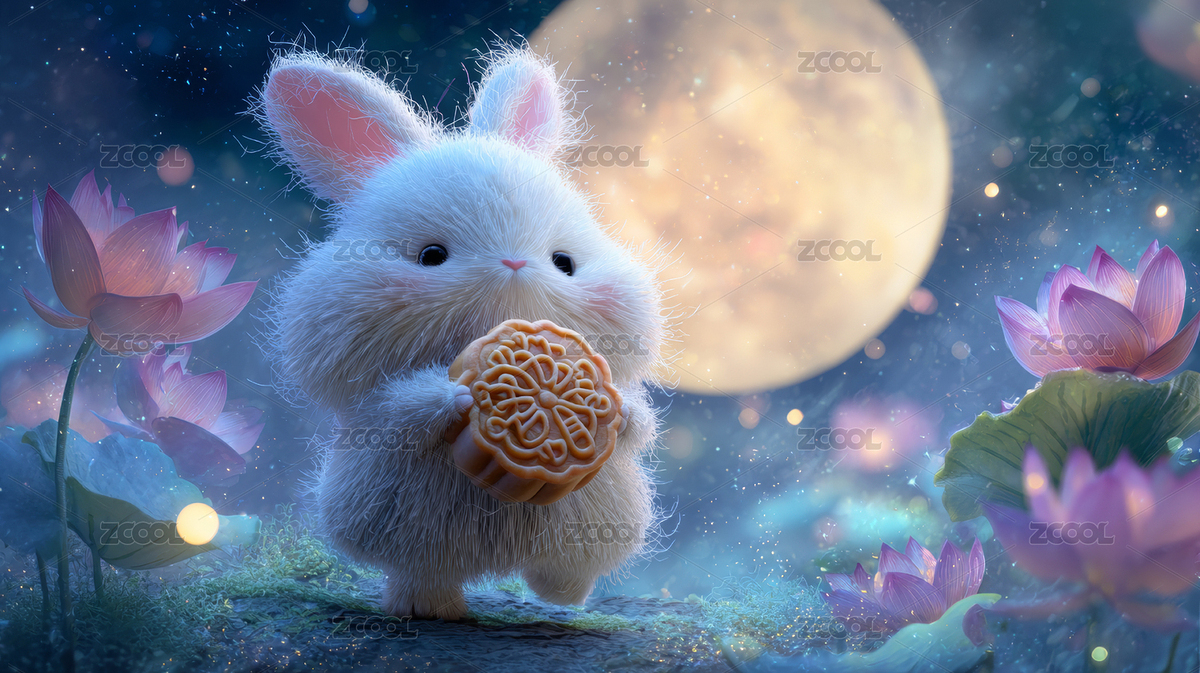 梦幻中秋节夜晚圆圆的月亮兔子抱着月饼