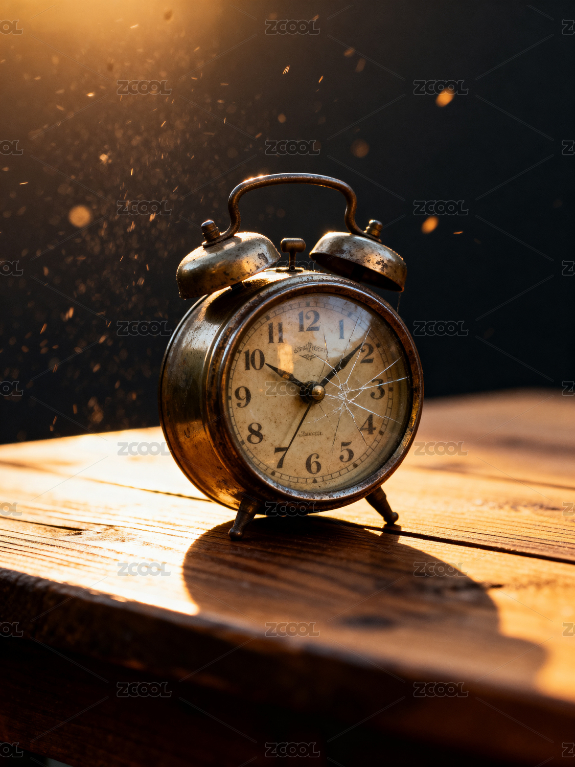 复古闹钟静置木桌光影斑驳