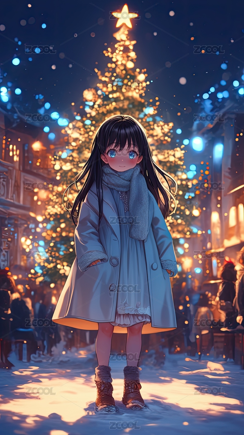 冬夜街头女孩与圣诞树