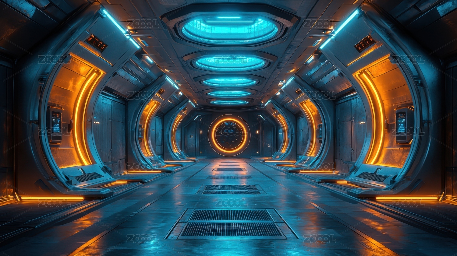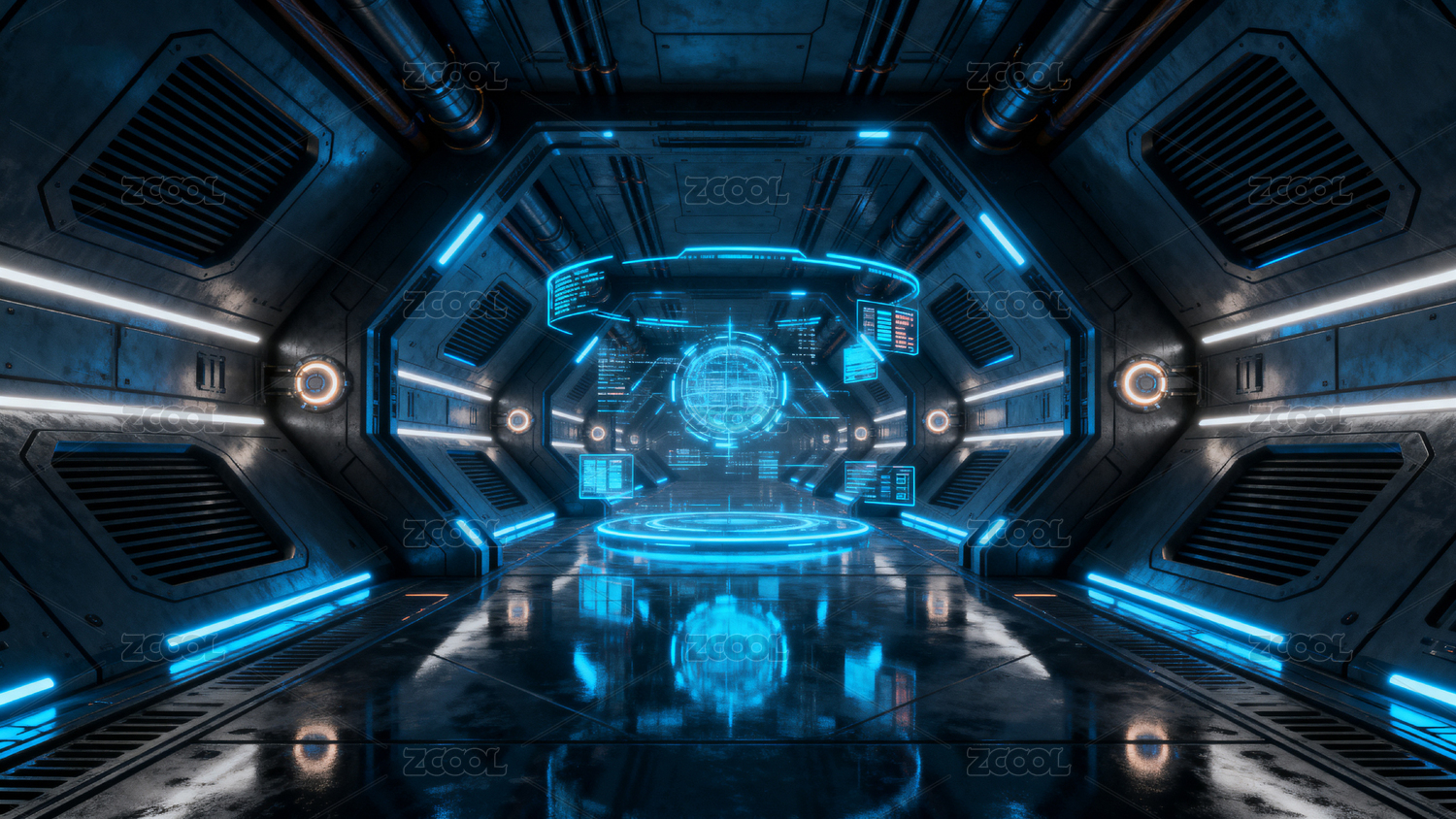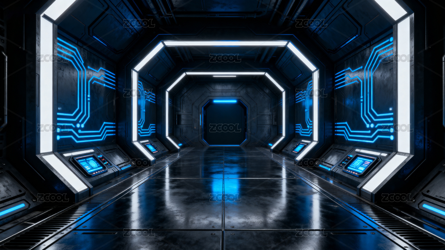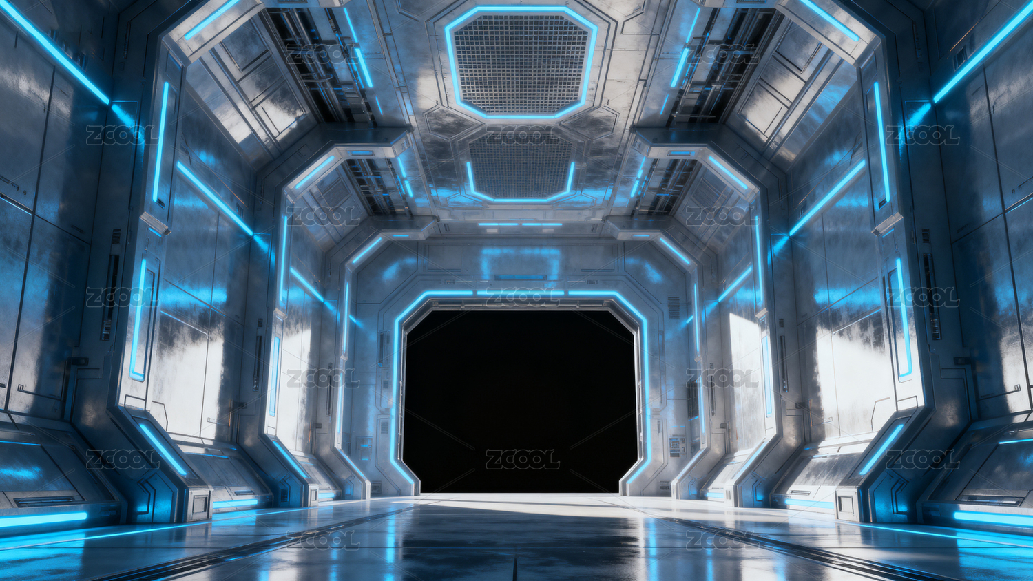 蓝光,墙壁,结构,灯光,反光,金属,走廊,管道,屏幕,地板