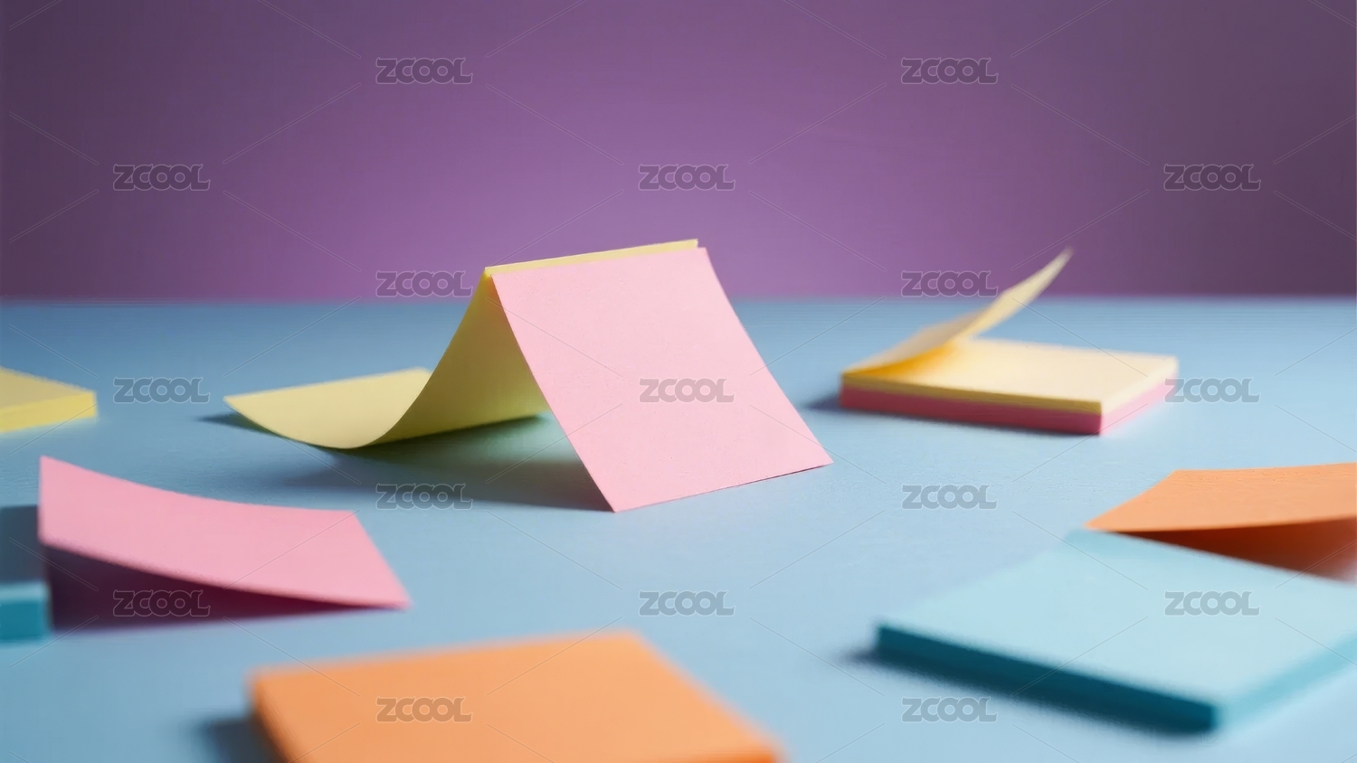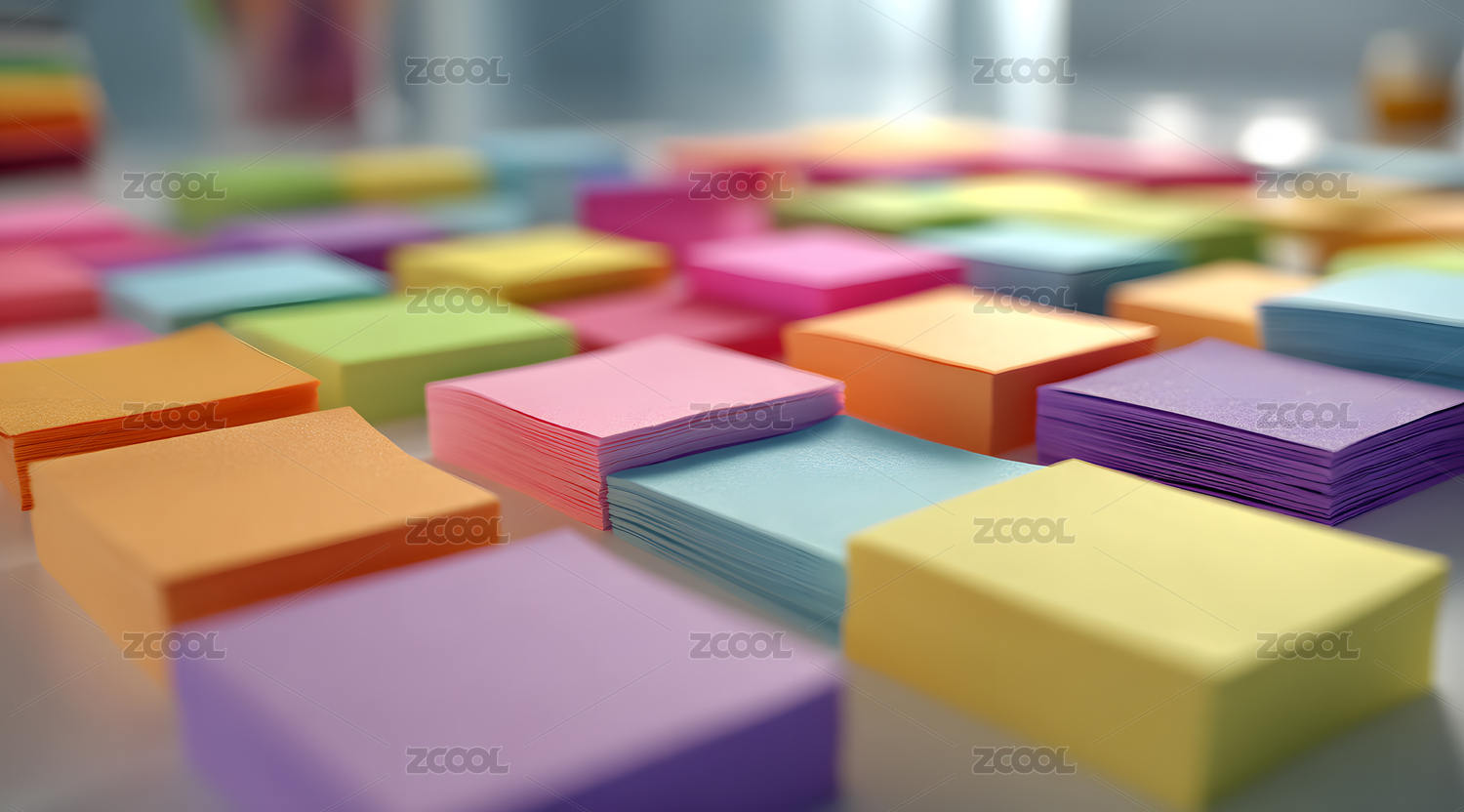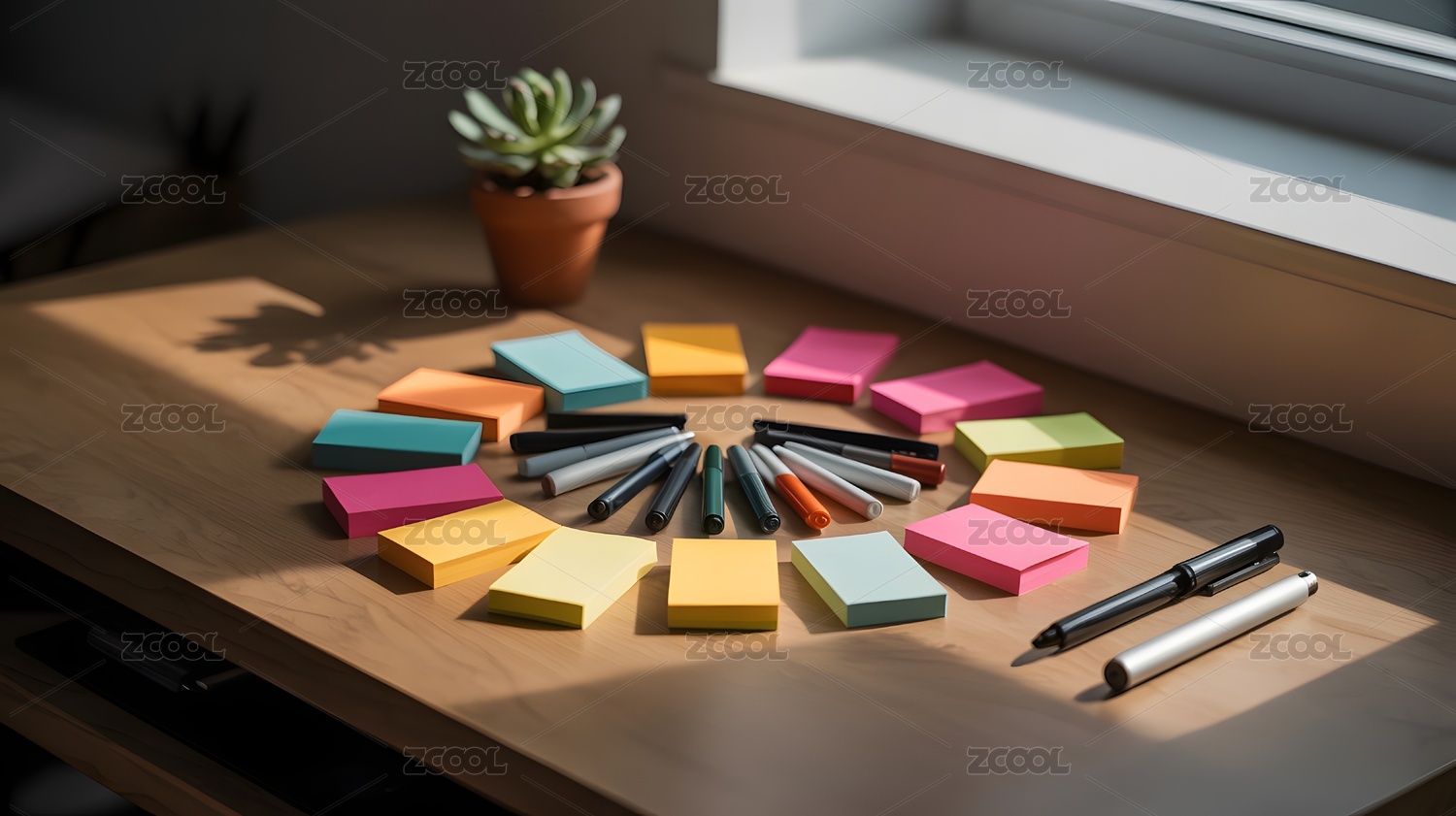 便签纸,彩色,堆叠,办公桌面,绿植,笔筒,笔,文件整理,记录,提醒