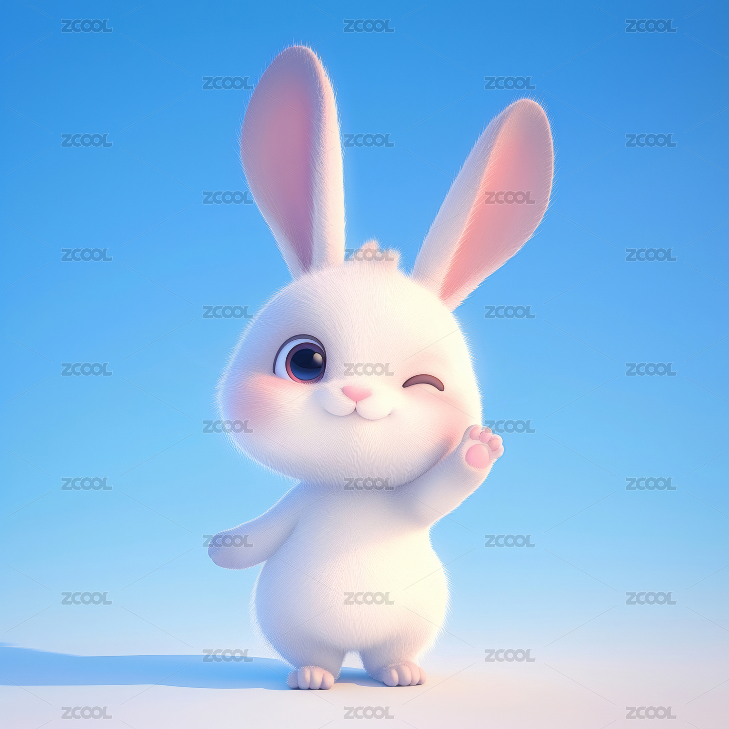 一只白兔特写镜头蓝色的背景长着粉红色的耳