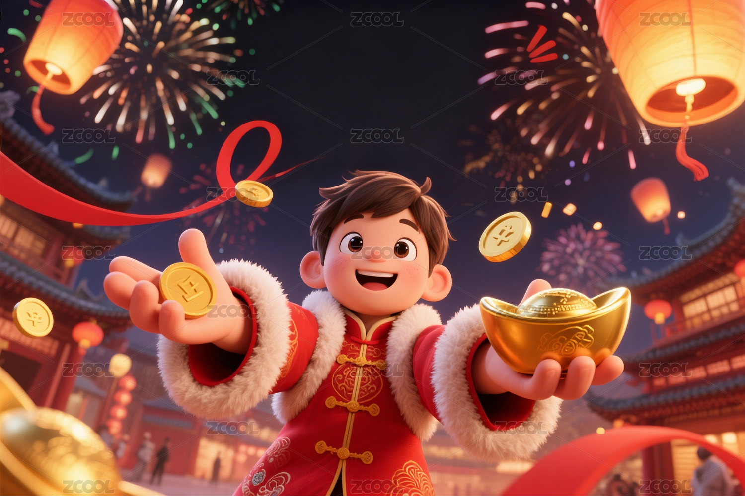 3d卡通插画手捧金元宝的红衣男孩贺新春