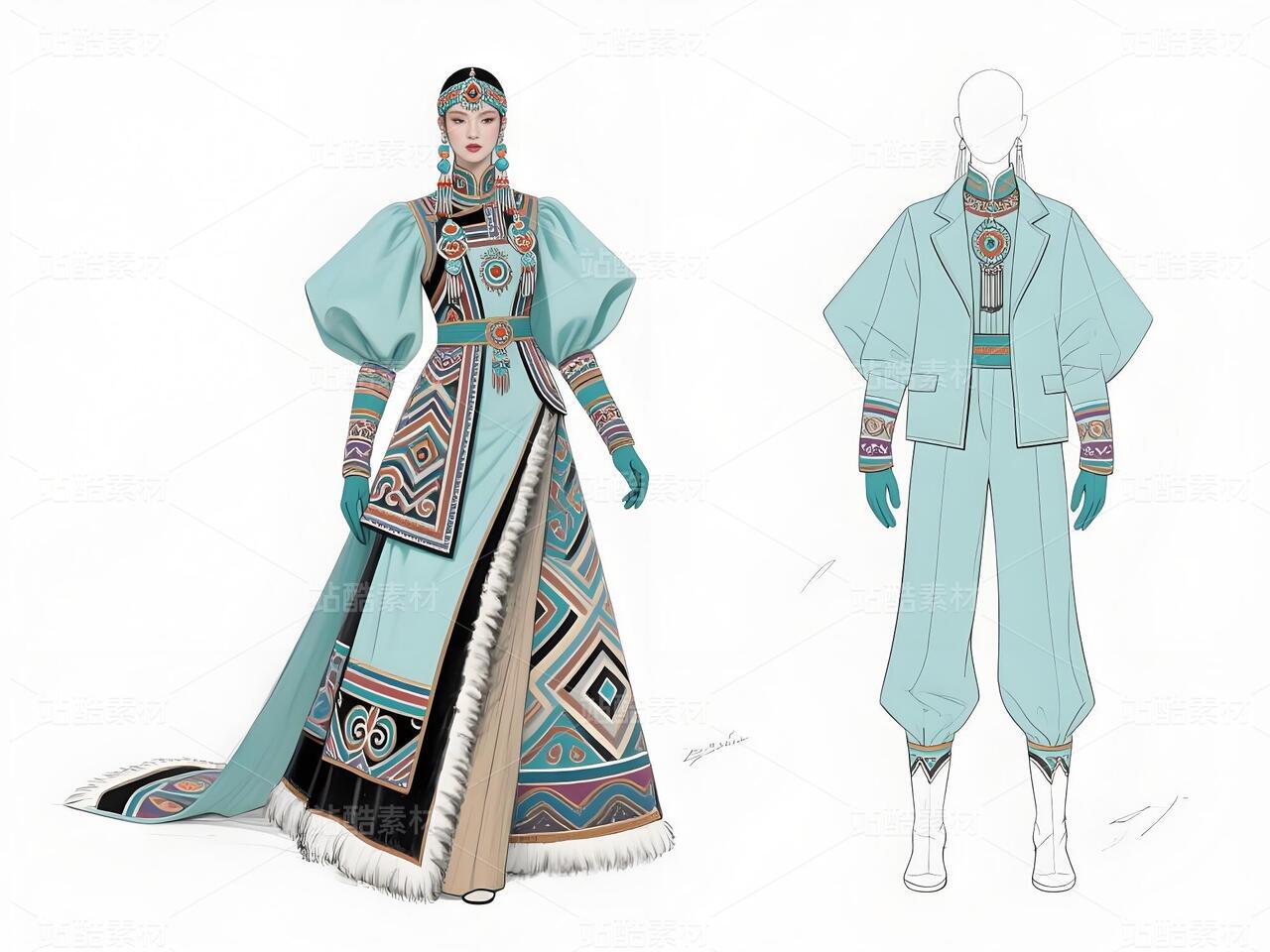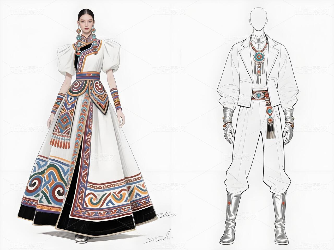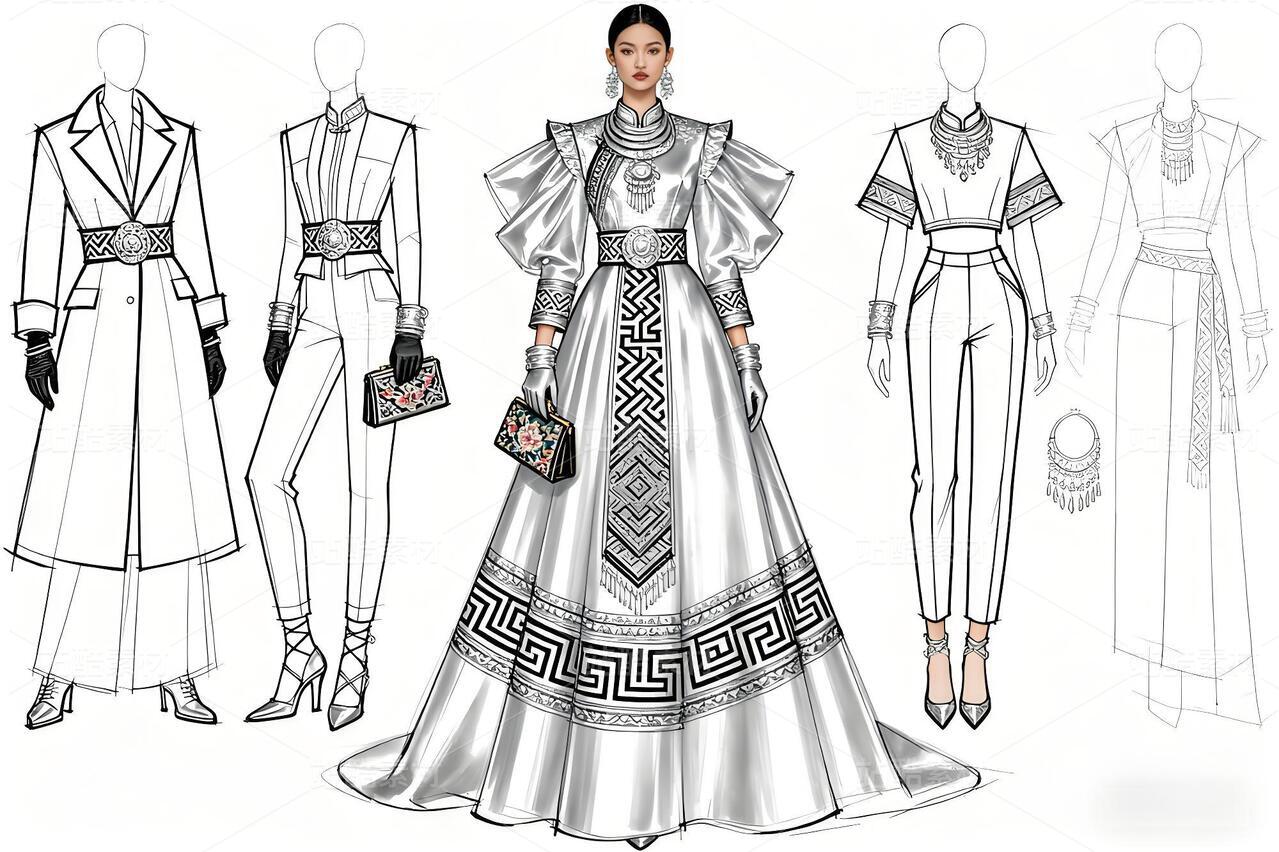 本系列“山水霓裳”是一次跨越时空的审美对话。我们以浅蓝与浅粉的扎染为底色,晕染出壮乡山水间的晨曦暮霭,柔和而富有诗意。核心将非遗壮锦的八角花、云水纹样,以精湛刺绣点缀于中式轻奢廓形之上。女士礼服层叠的薄纱如云雾缭绕,男士套装挺括的线条见山岳风骨。这不仅是对壮族文化的致敬,更是对其进行的当代化、时尚化转译。我们让古老的织锦技艺走出历史,化身为当代绅士与淑女身上流动的艺术,证明民族的就是世界的,传统亦可轻盈、浪漫且高级。此设计旨在探索高定服饰与文化传承共生的全新可能。