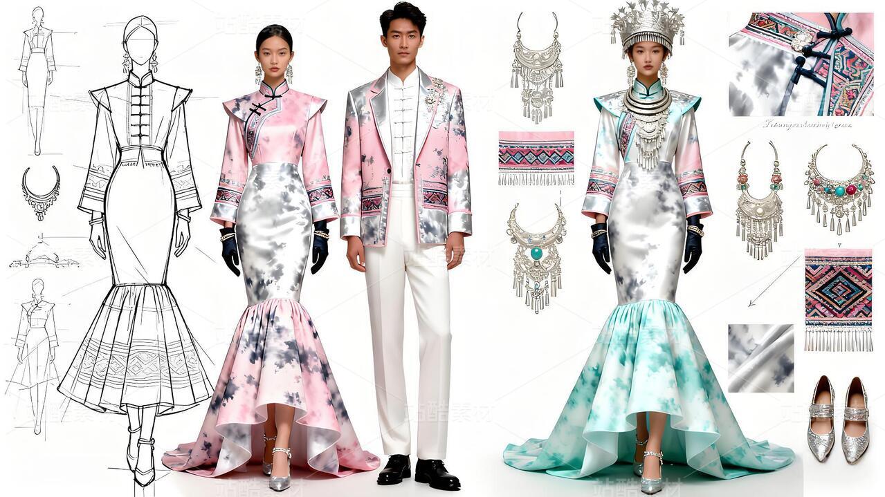 本系列“锦簇花谣”以浪漫的浅粉色为基调,重新诠释壮族非遗的时尚魅力。设计巧妙地将象征繁荣的壮锦花卉纹与八角花纹融入中式剪裁:女士礼服将薄纱斗篷的柔美与修身裙装的典雅结合,通体的壮锦刺绣宛如一幅春日花园;男士套装则以温润的浅粉色彩,搭配精致的壮锦滚边,于谦和儒雅中透出文化自信。我们致力于打破民族服饰的传统边界,用高定的语言将壮锦文化融入现代生活。这不仅是一次色彩的创新,更是对非遗技艺的温情致敬,让古老的织锦在粉色的浪漫中,诉说新的民族时尚故事。