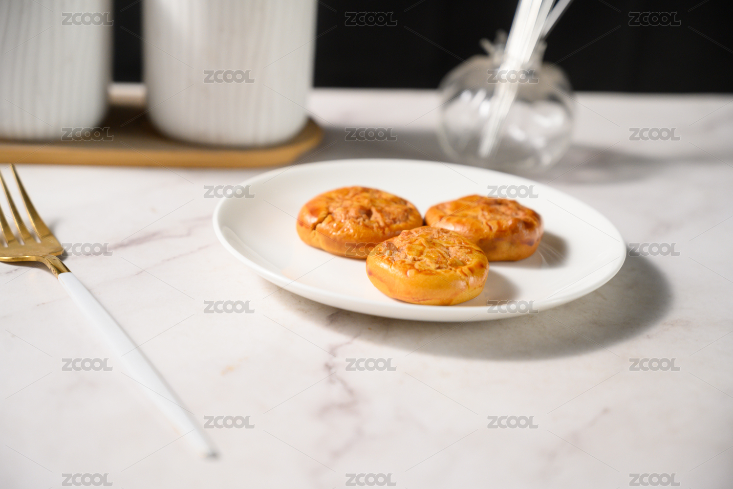 桌面上的白盘子里的美味可口的鸡仔饼