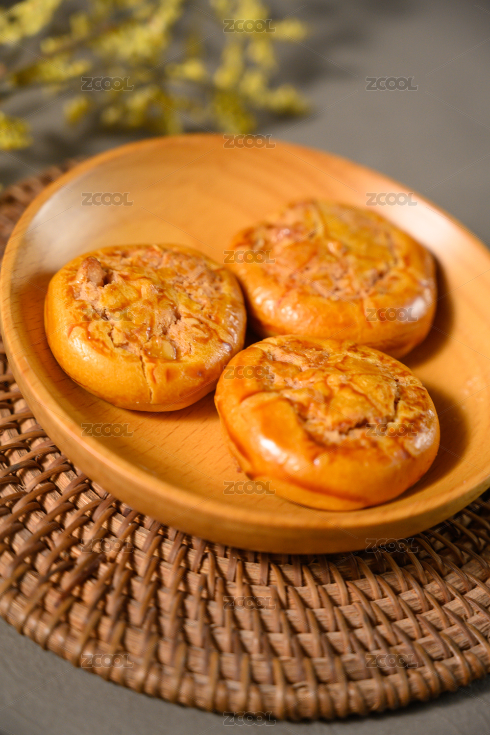 桌面上的白盘子里的美味可口的鸡仔饼