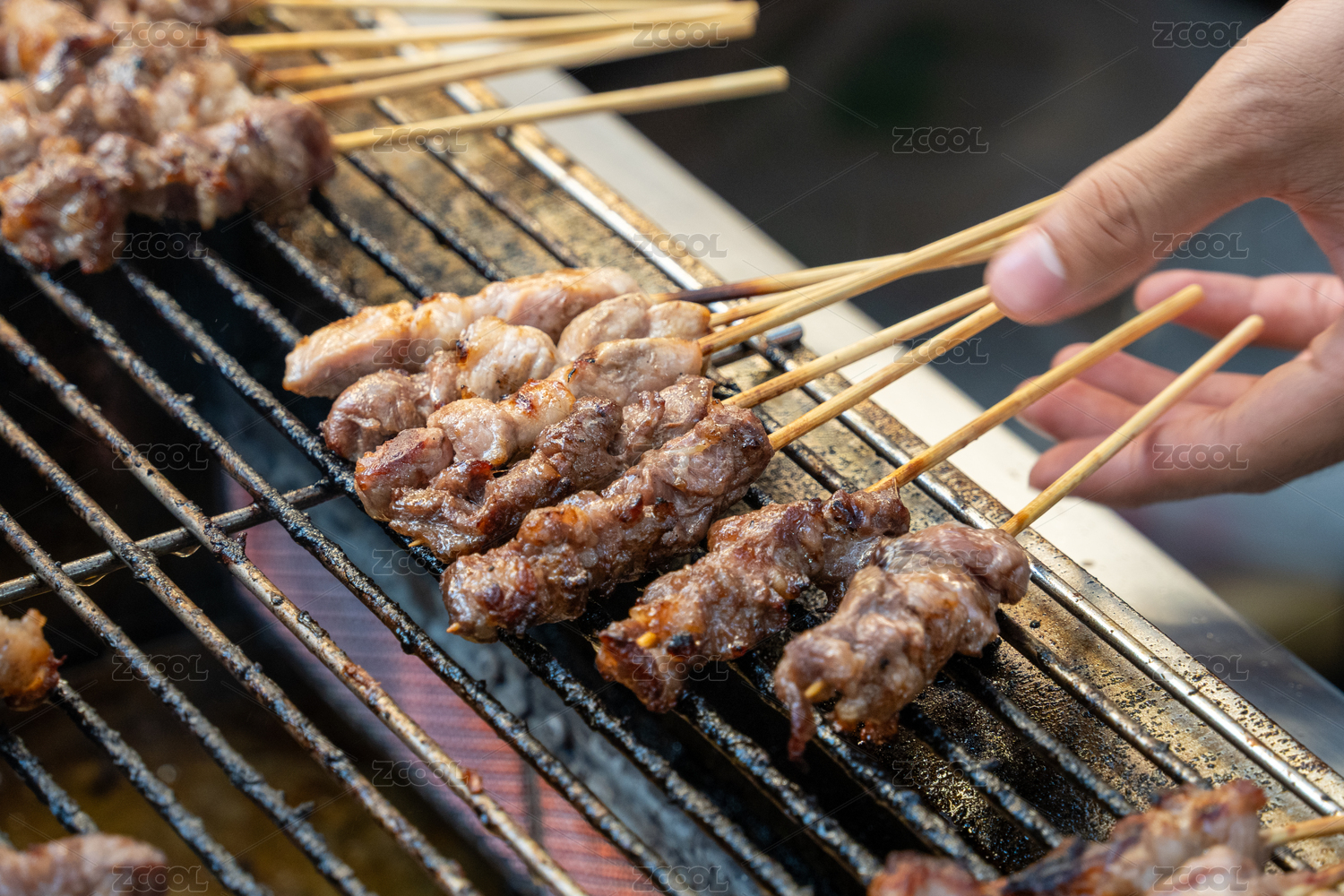 正在烧烤炉上烤制的新疆风味小吃羊肉串
