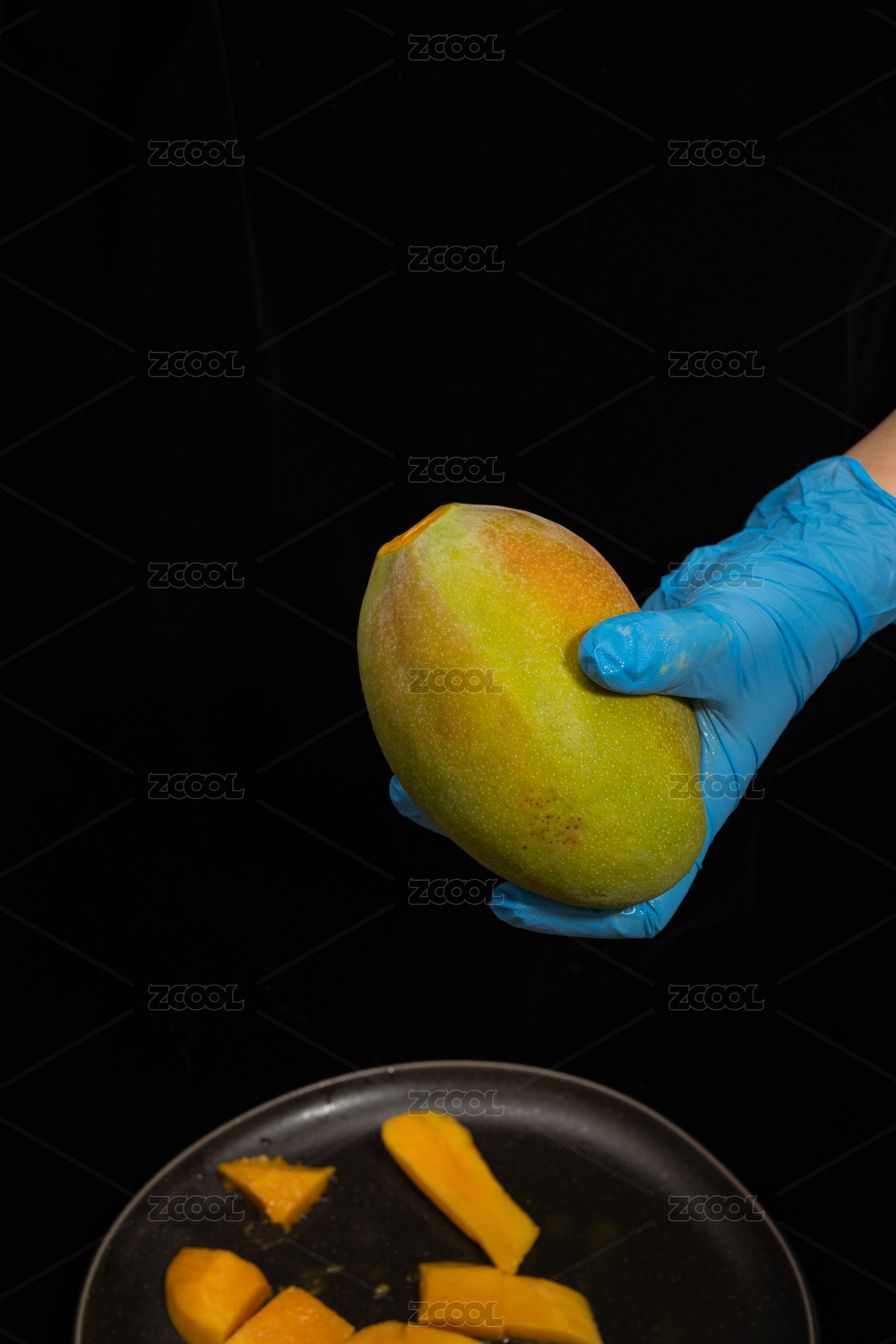 手,新鲜,食物,烹饪,厨房,芒果,蓝色,手套,黑色,背景