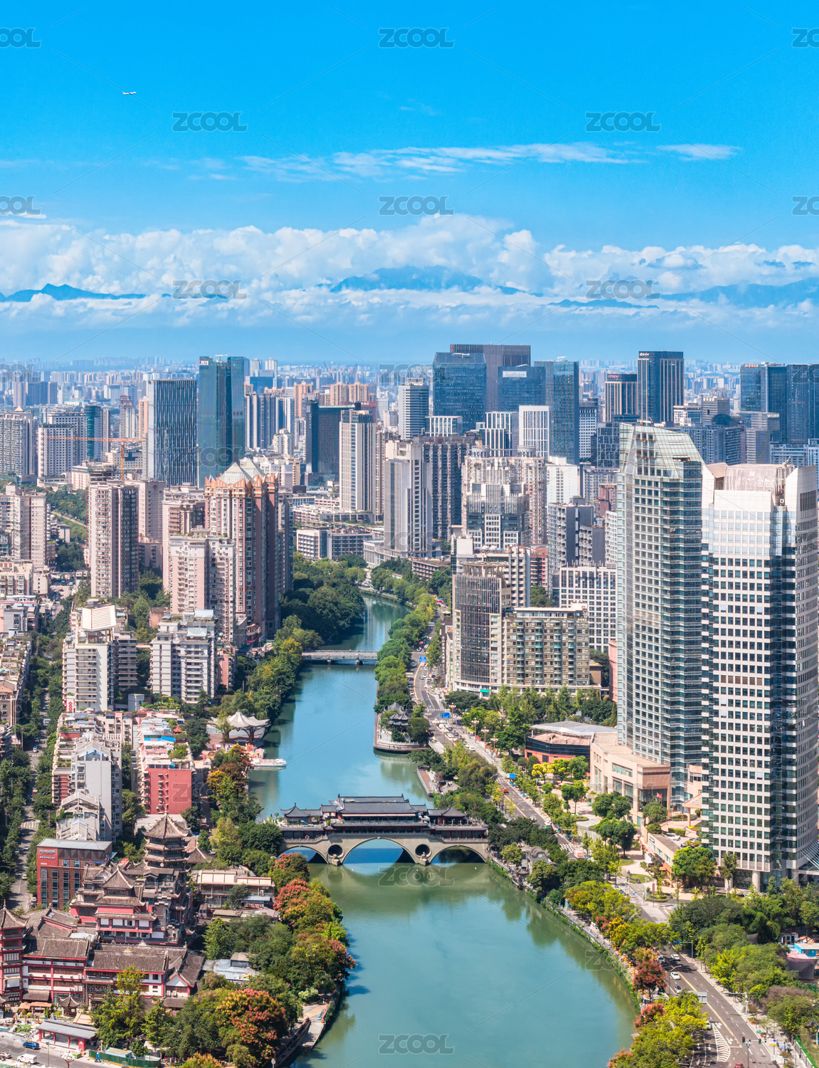 中国成都府南河上的九眼桥及周边建筑航拍图