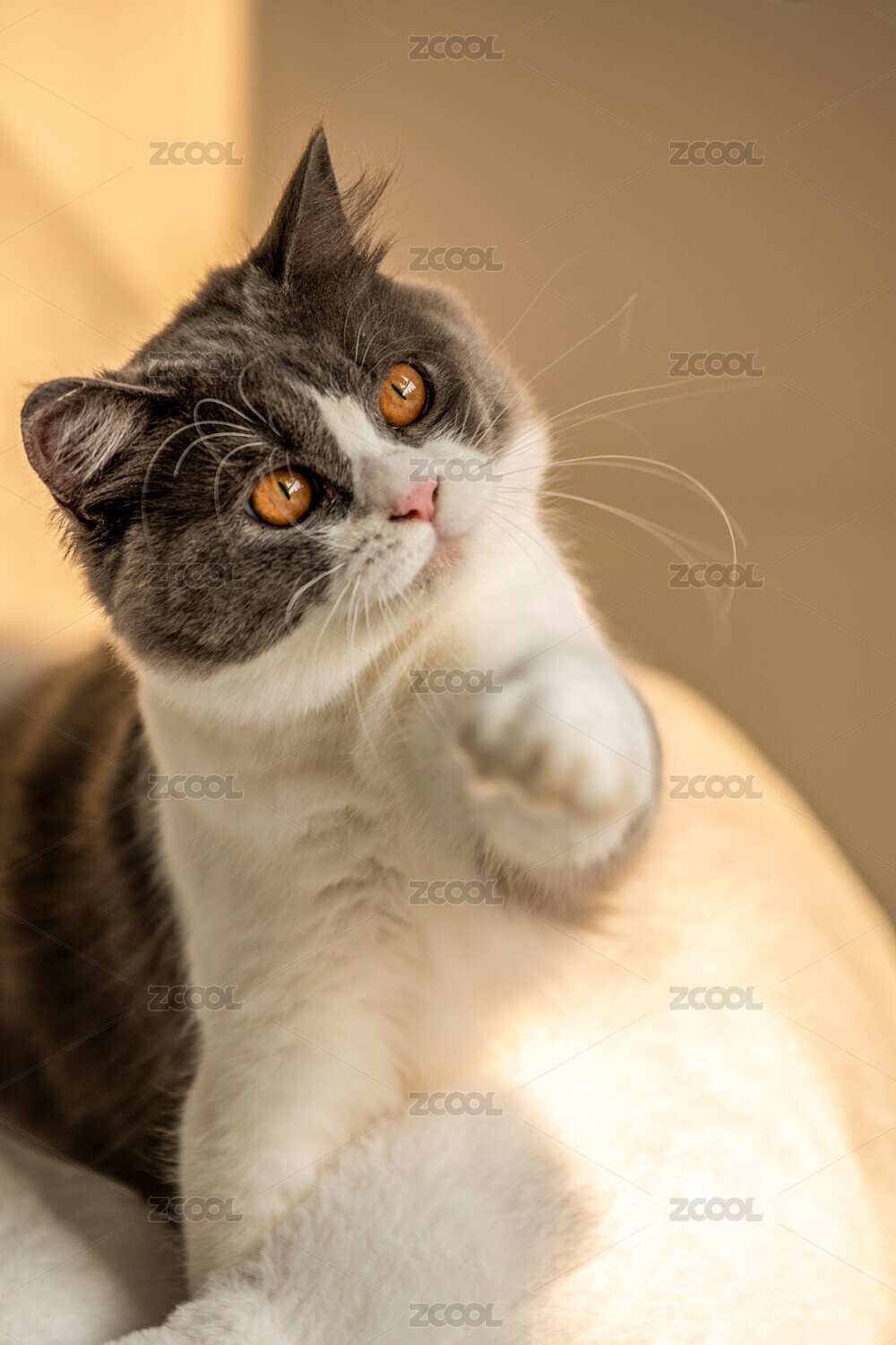 一只可爱的英短蓝白猫在家中的窗台上玩耍