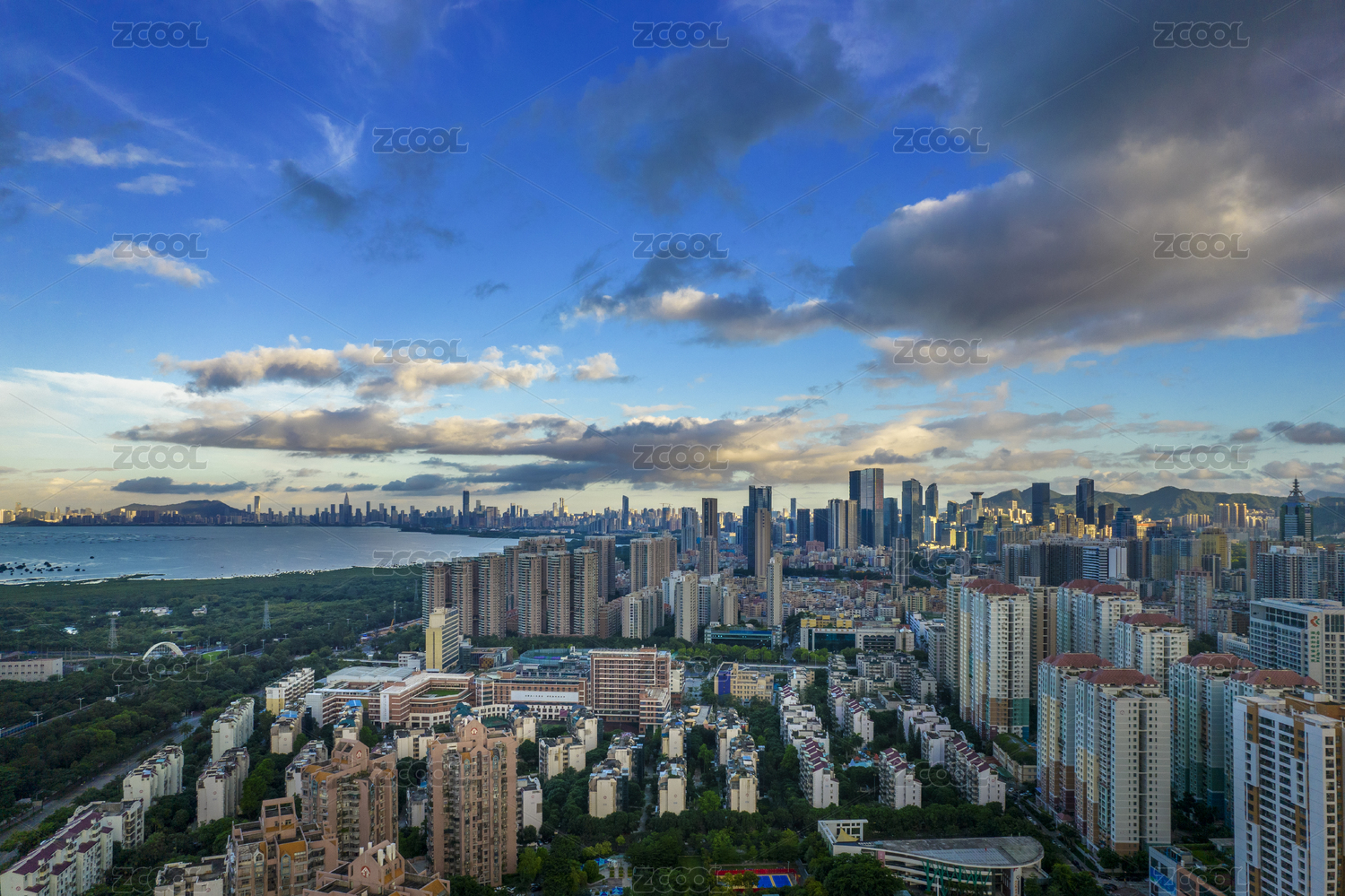 夕阳下的深圳湾全景图景观