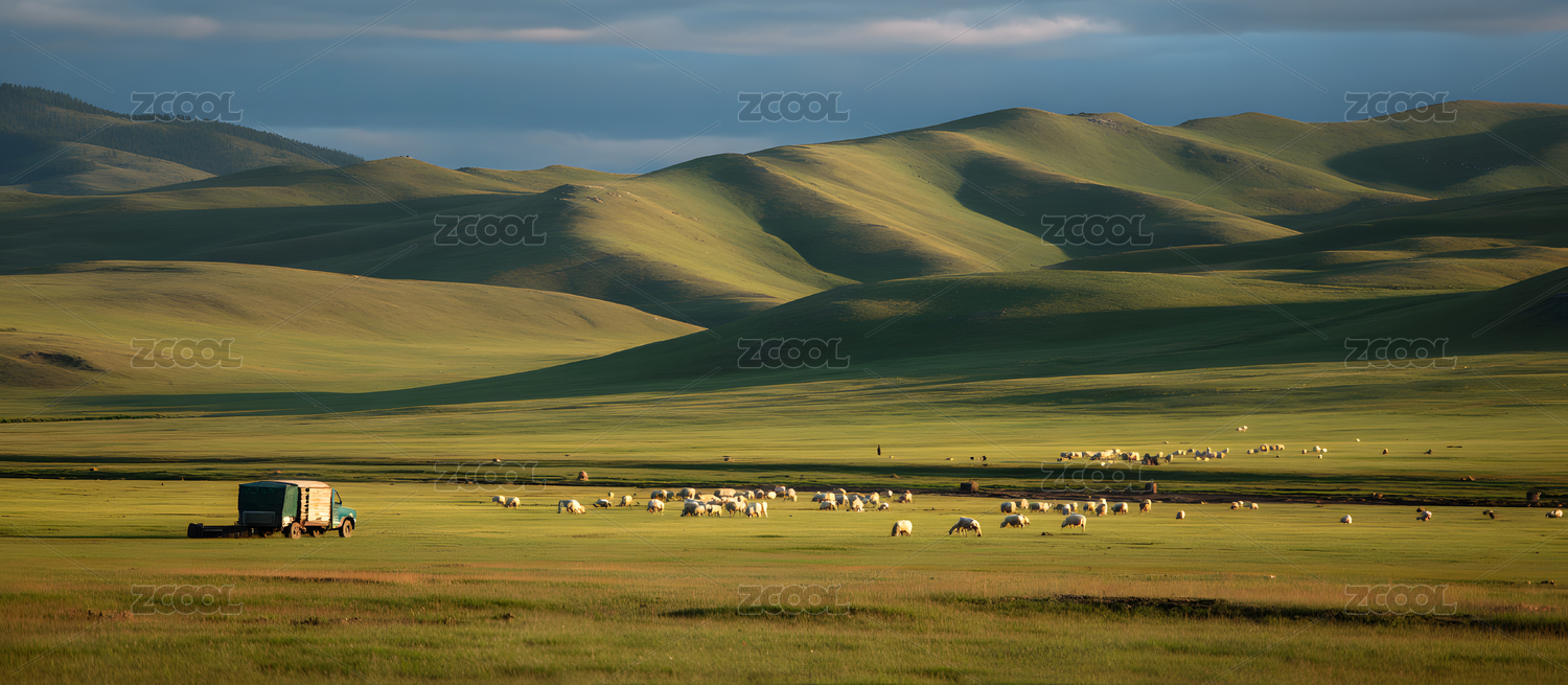 莫尔格勒河畔金帐汗草原的羊群、马群、牛群