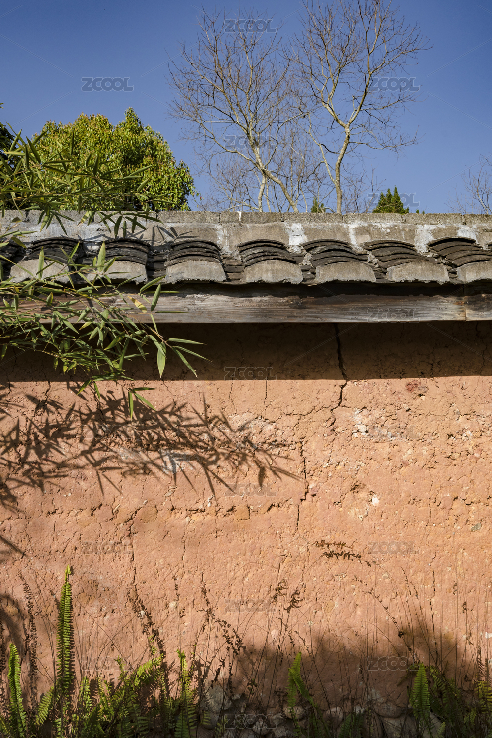 屋檐下的黄色泥土墙及投射在上面的竹影