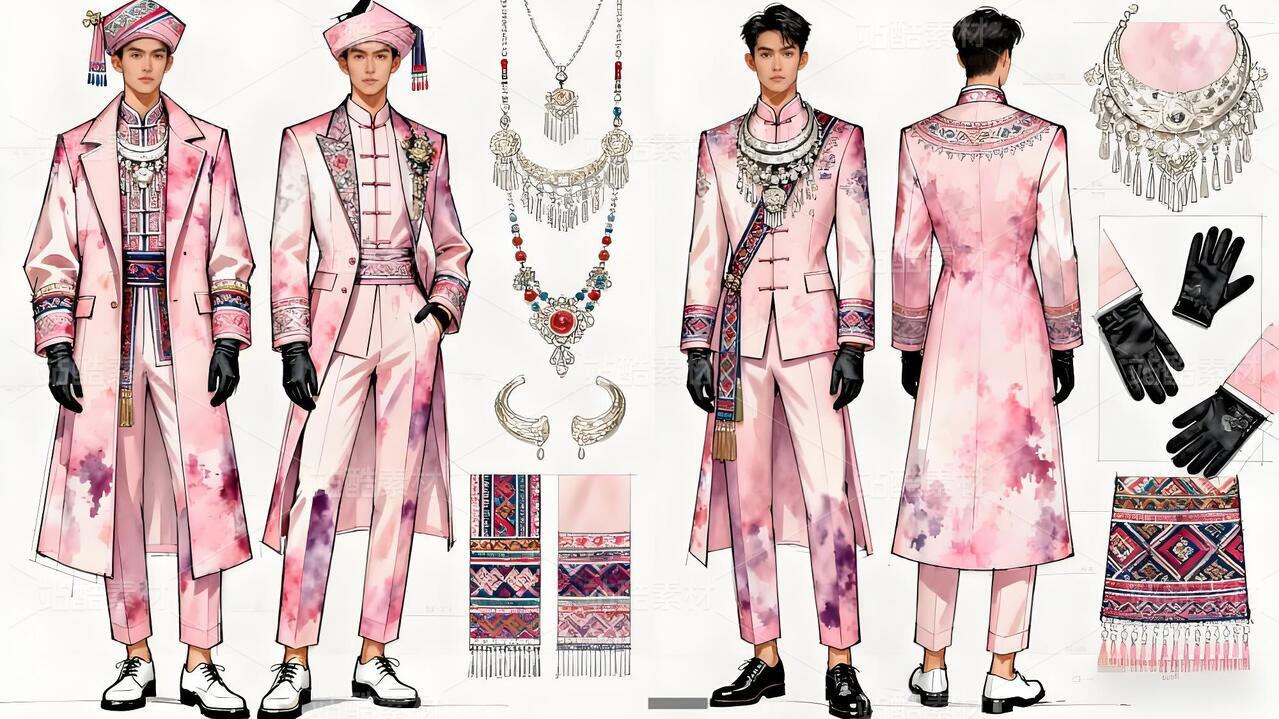 “月下织梦”系列是一次对壮族非遗的浪漫解读。我们以浅粉的温柔、银白的光华、浅青的澄澈,构建出一幅月下山水画卷。设计上,将标志性壮锦纹样巧妙重构:女士礼服以云雷纹腰封束出东方韵味,层叠渐变的纱裙如月华倾泻;男士套装则通过几何纹细节,在简约现代中注入文化密码。本系列摒弃了符号化的民族表达,转而以高定工艺探讨传统与现代的共融——让壮锦不再是遥远的图腾,而是可穿戴的、流动的月光诗篇。这不仅是一场时尚革新,更是向匠心独运的非遗技艺致以的最高敬意,让古老文明在当代焕发崭新生命力。