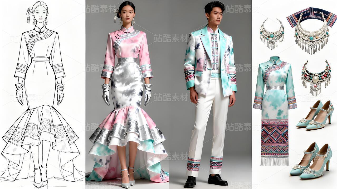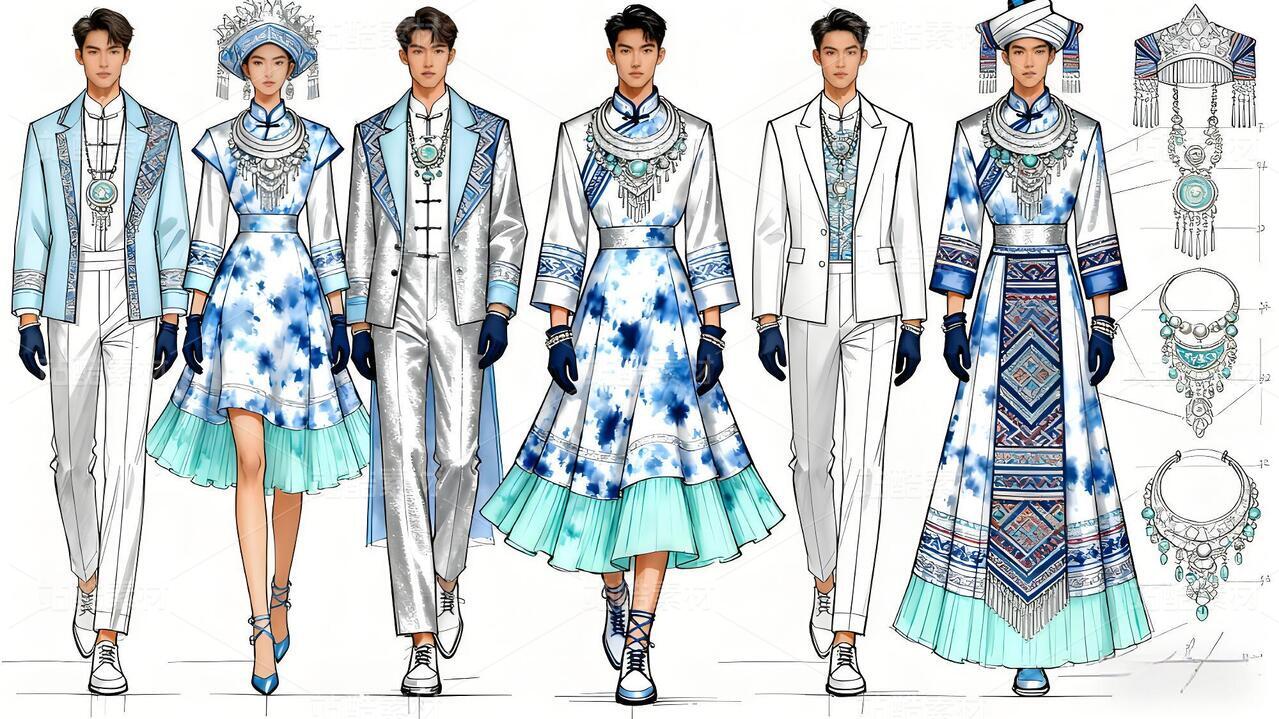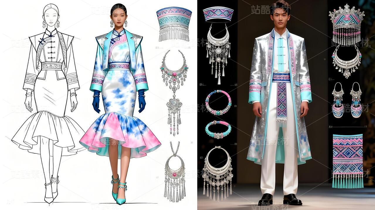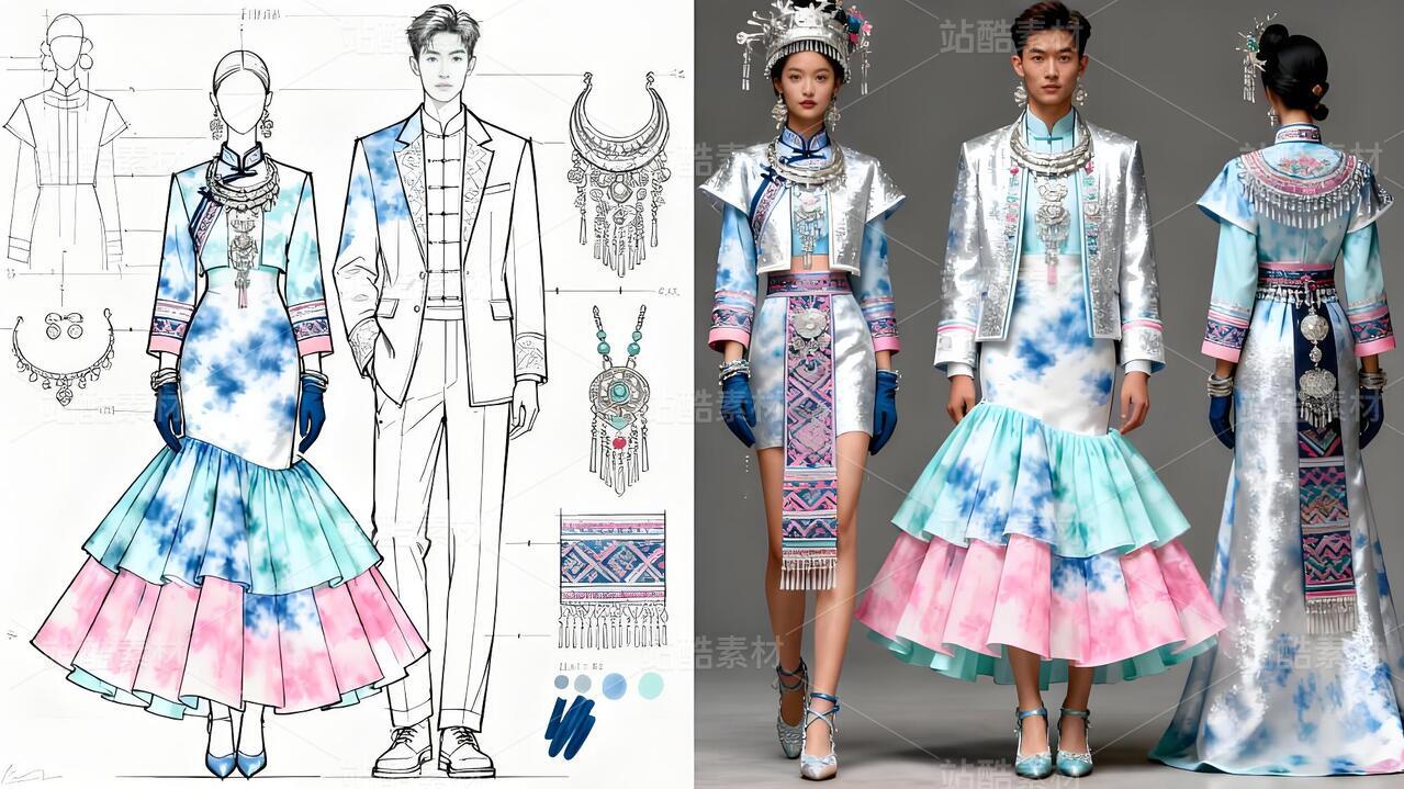 “月下织梦”系列是一次对壮族非遗的浪漫解读。我们以浅粉的温柔、银白的光华、浅青的澄澈,构建出一幅月下山水画卷。设计上,将标志性壮锦纹样巧妙重构:女士礼服以云雷纹腰封束出东方韵味,层叠渐变的纱裙如月华倾泻;男士套装则通过几何纹细节,在简约现代中注入文化密码。本系列摒弃了符号化的民族表达,转而以高定工艺探讨传统与现代的共融——让壮锦不再是遥远的图腾,而是可穿戴的、流动的月光诗篇。这不仅是一场时尚革新,更是向匠心独运的非遗技艺致以的最高敬意,让古老文明在当代焕发崭新生命力。