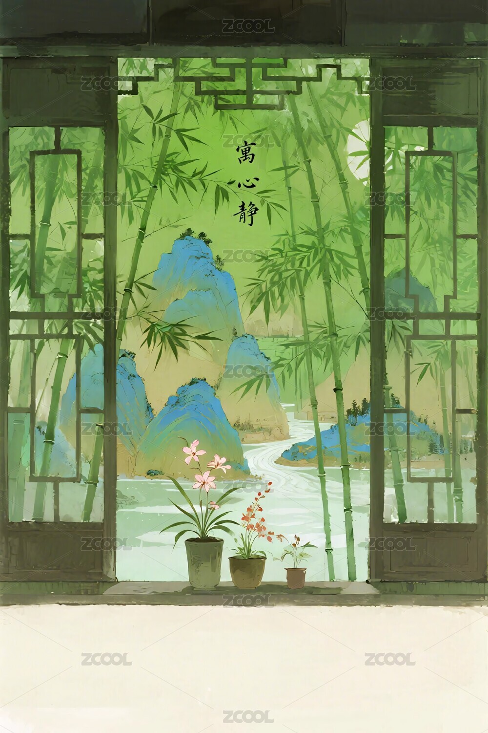中式门窗外山水竹景画