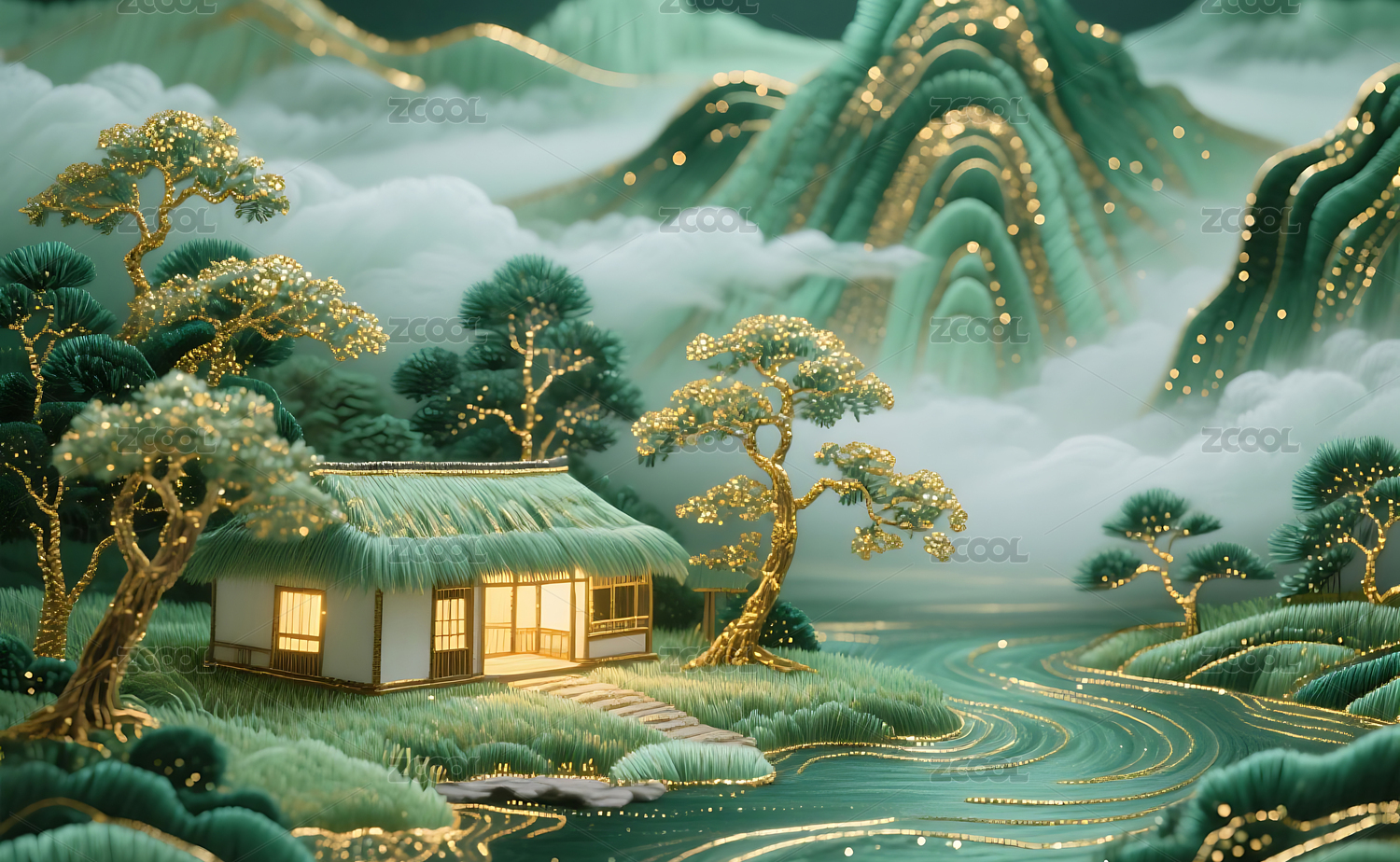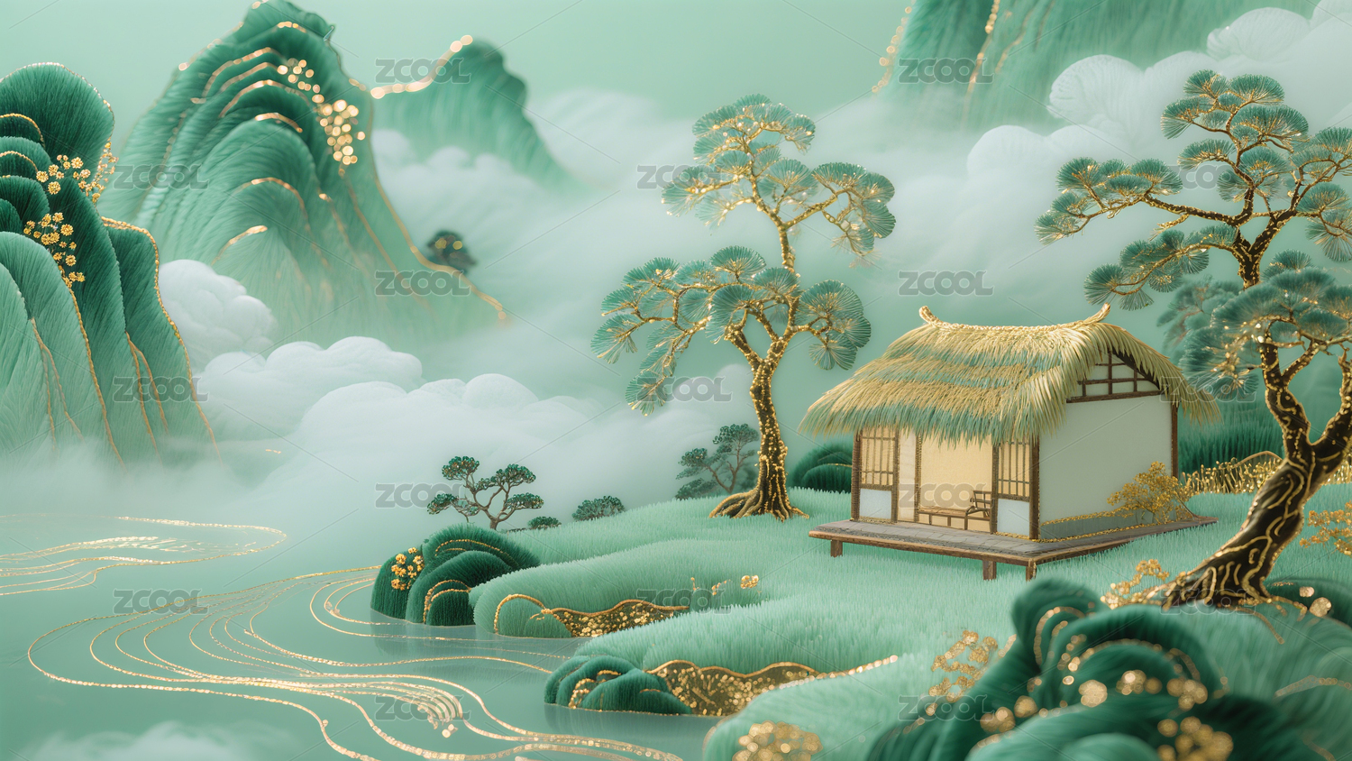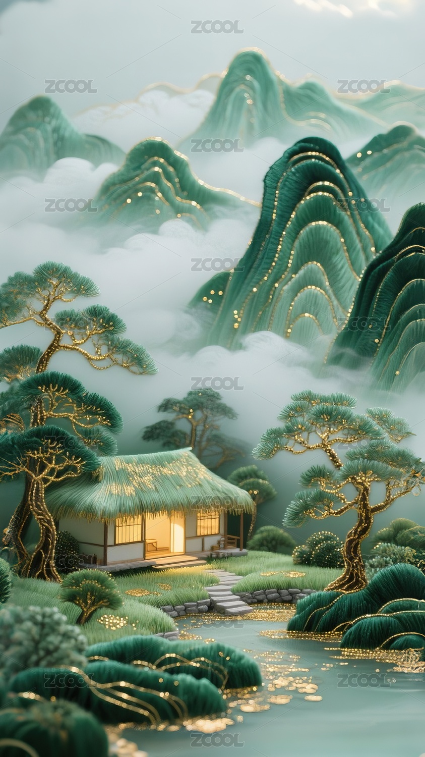 山水间茅屋云雾缭绕