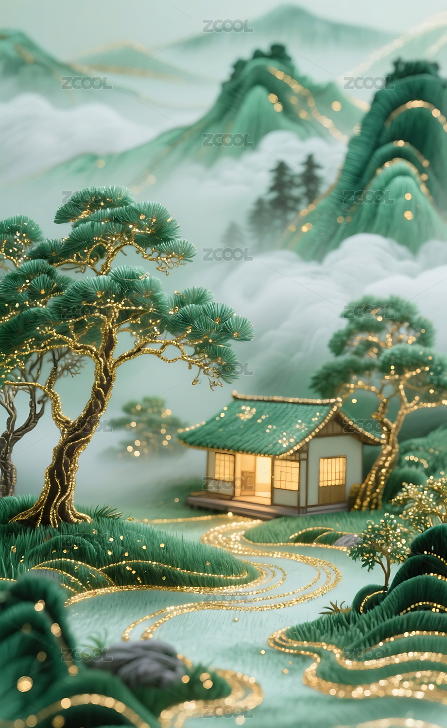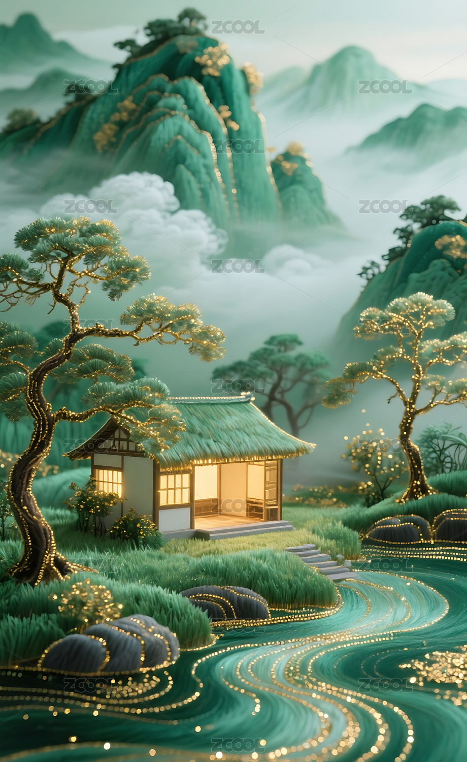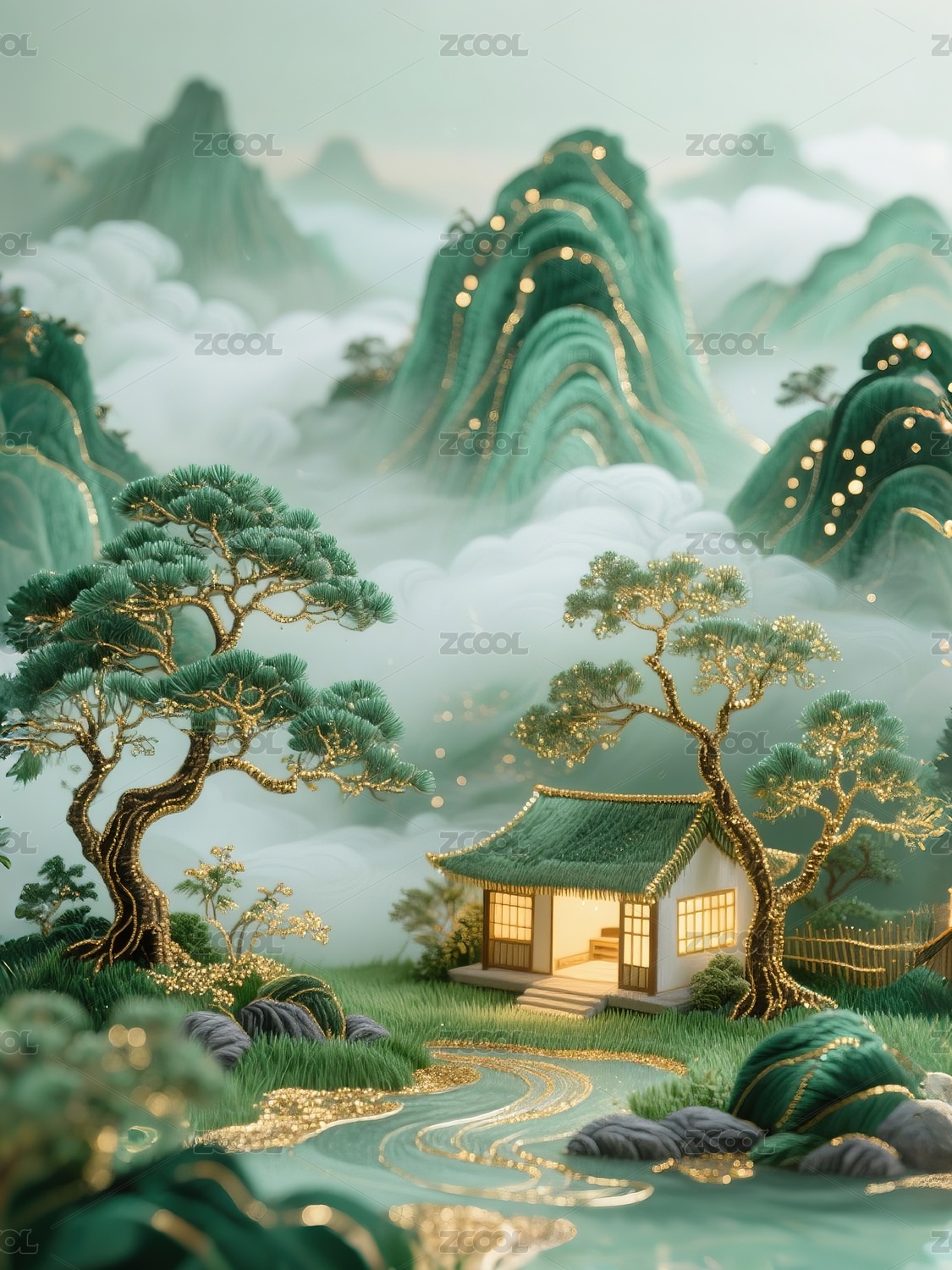 山水间茅屋云雾缭绕