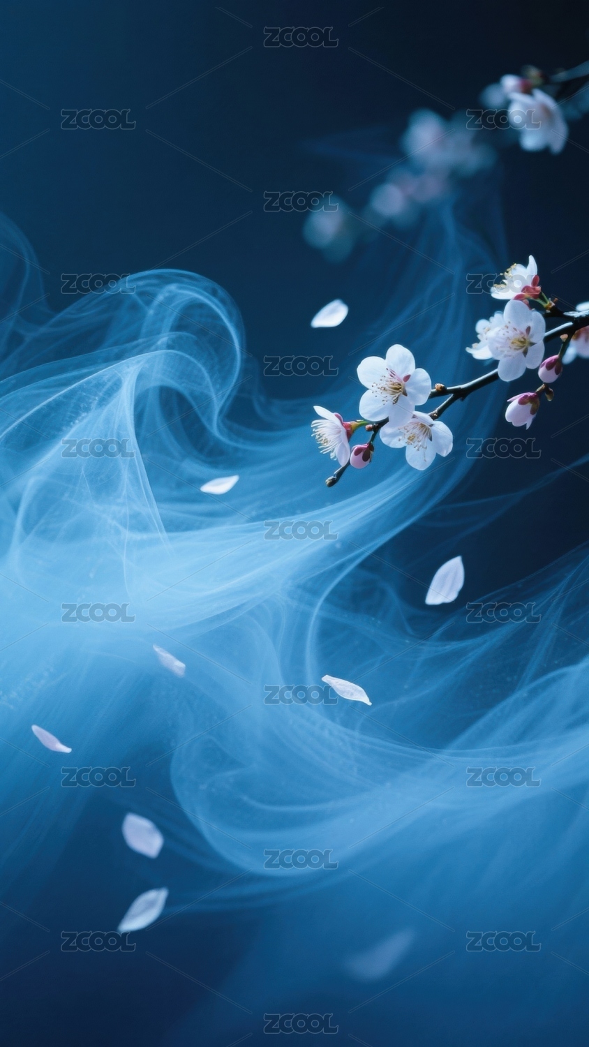 樱花枝与蓝色烟雾飘动