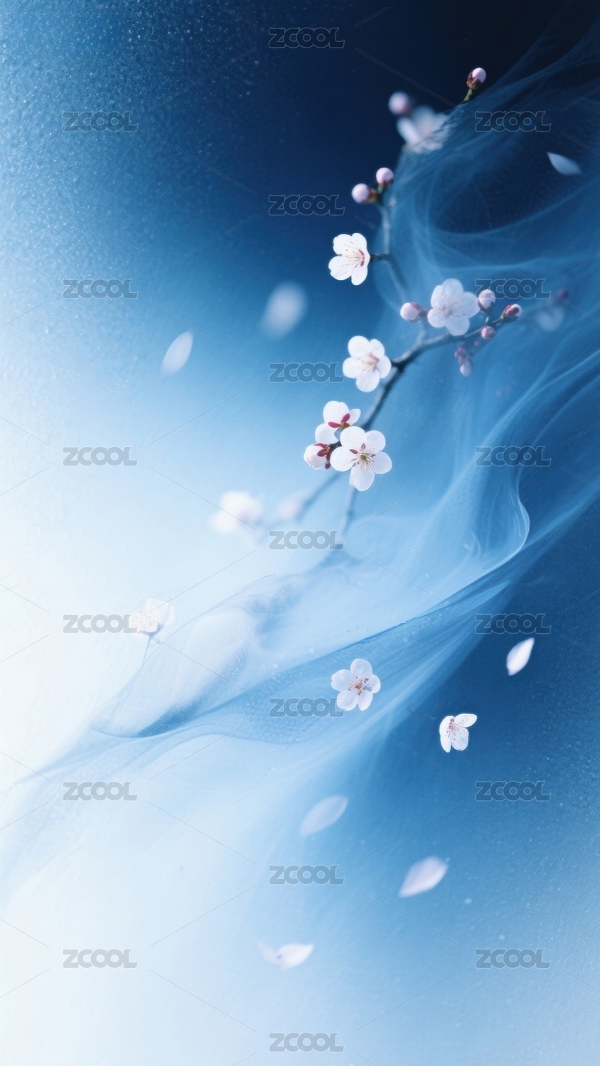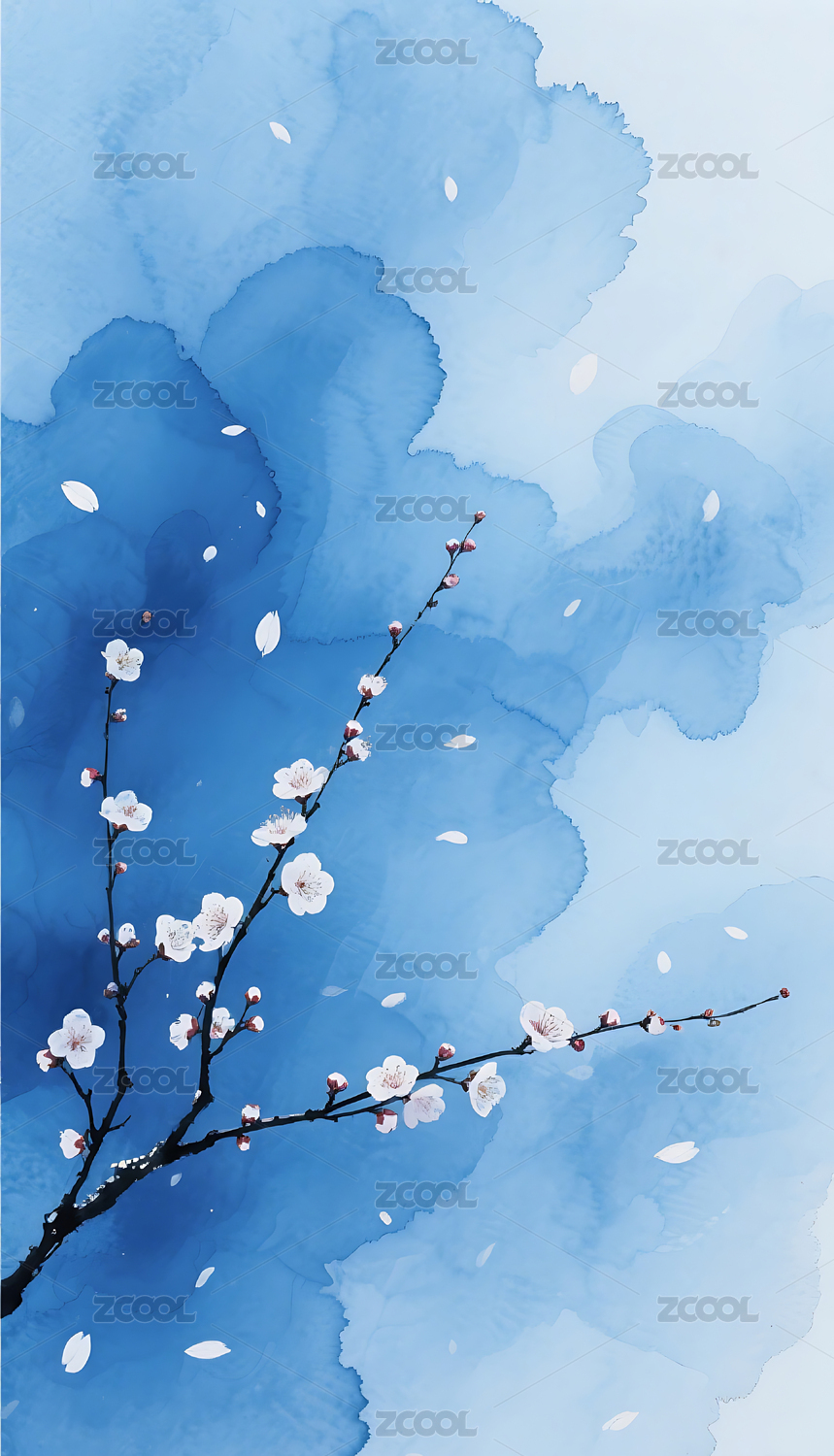 青蓝水墨背景与樱花枝条