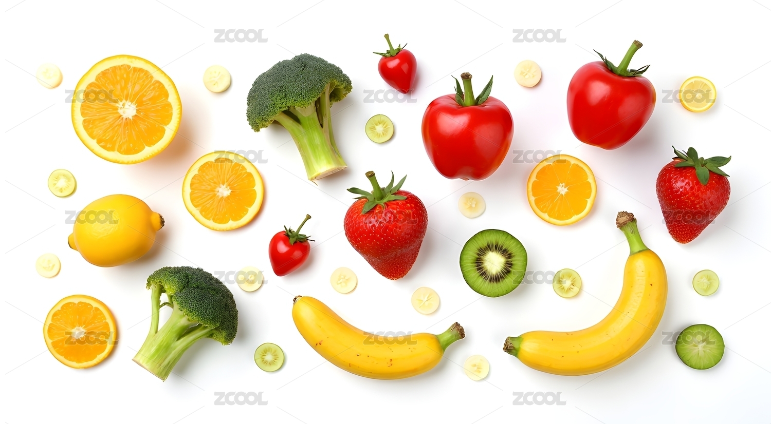 木纹背景上多种新鲜蔬菜水果俯拍留白