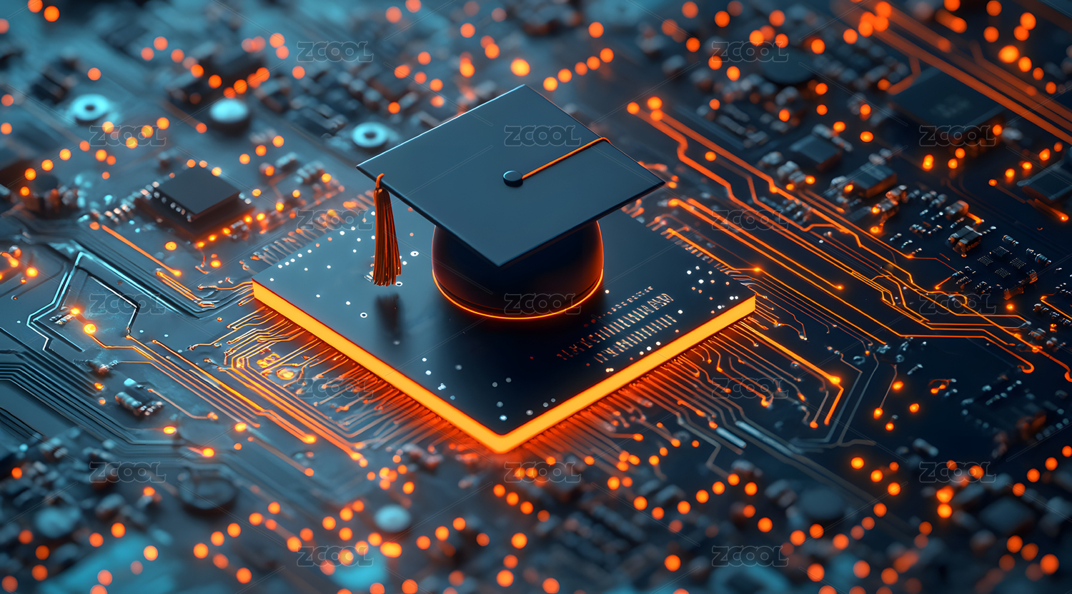 毕业帽置于电路板上的科技场景