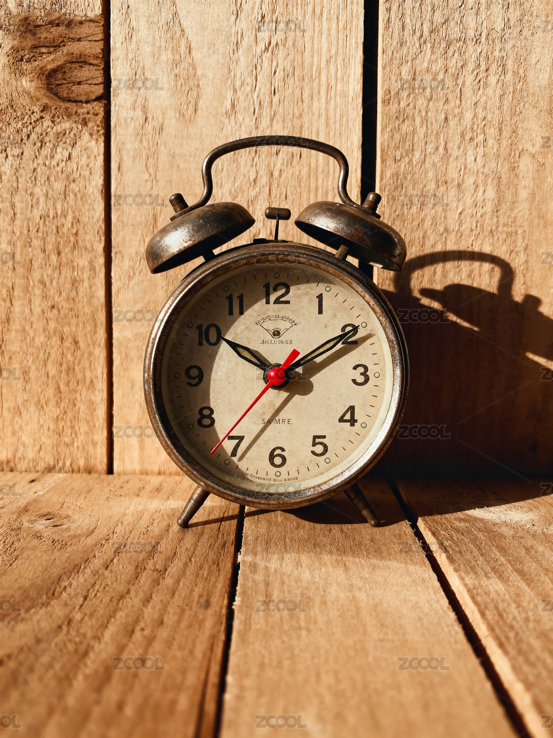 复古闹钟静置于木质桌面