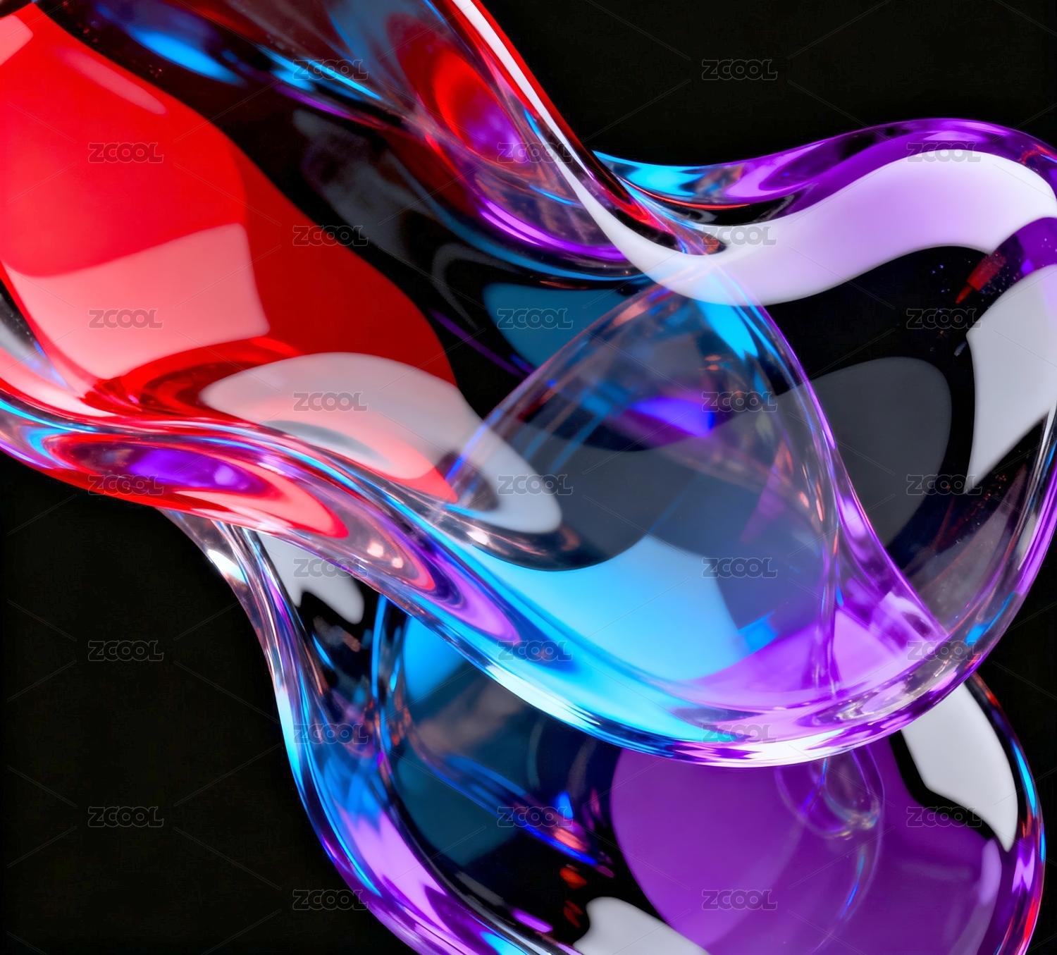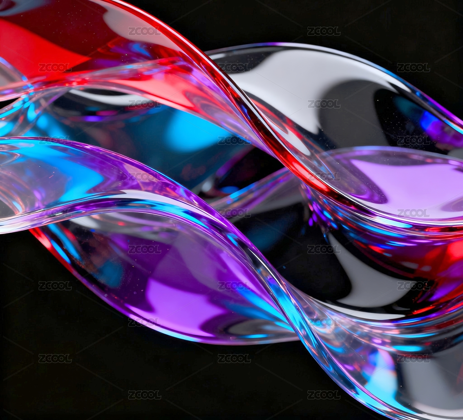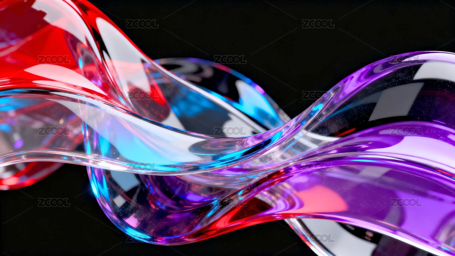 黑色背景下彩色波浪透明玻璃反射的抽象背景