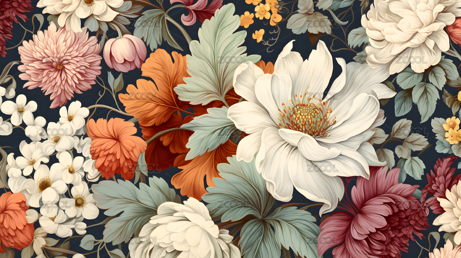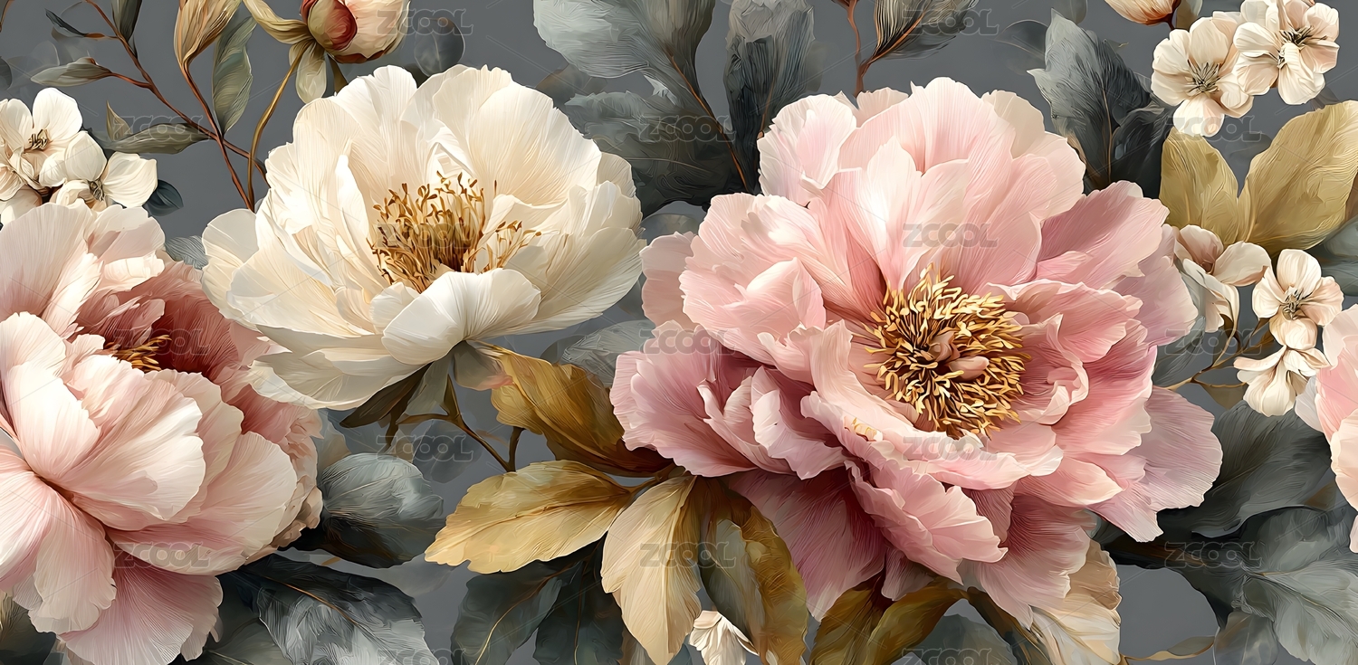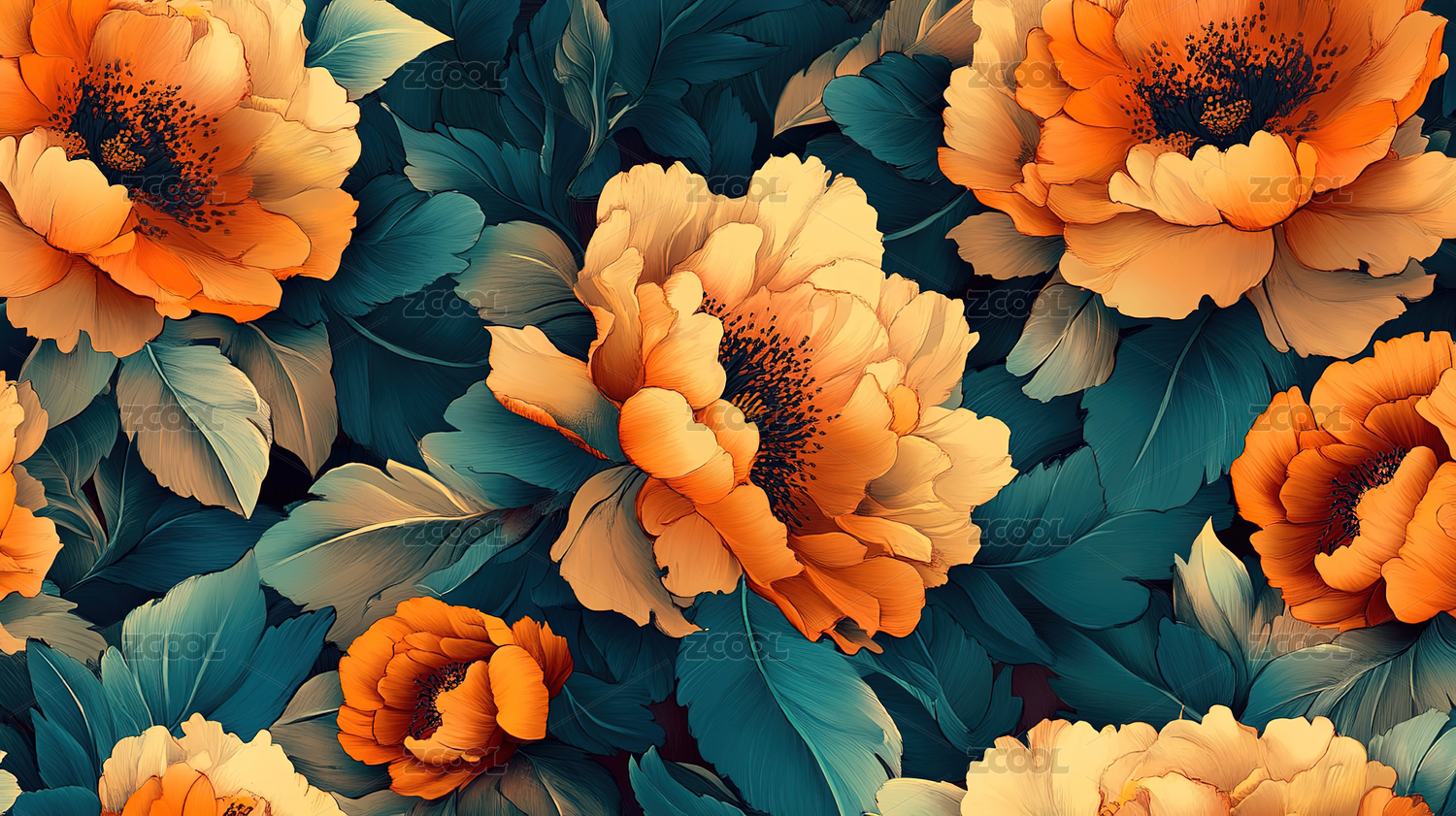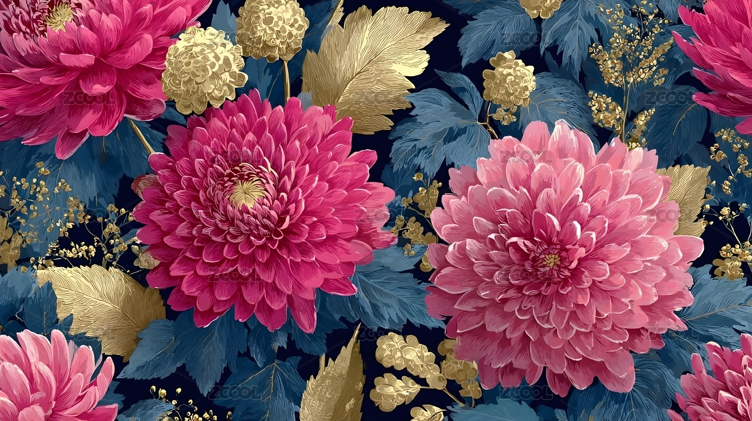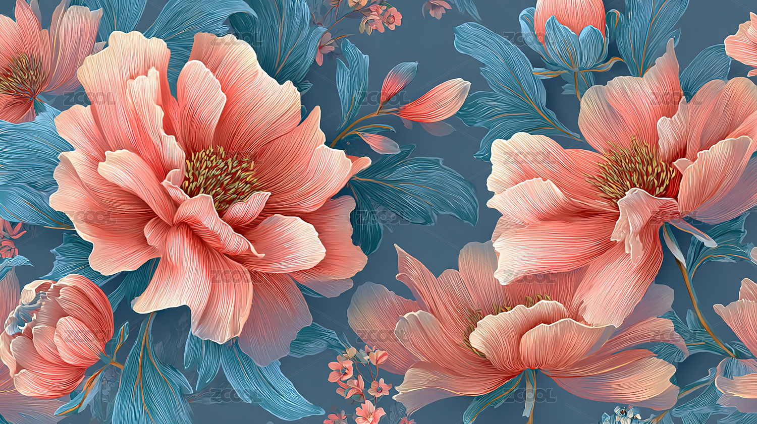 红牡丹簇拥在翠蓝底纹上绽放,优雅静谧