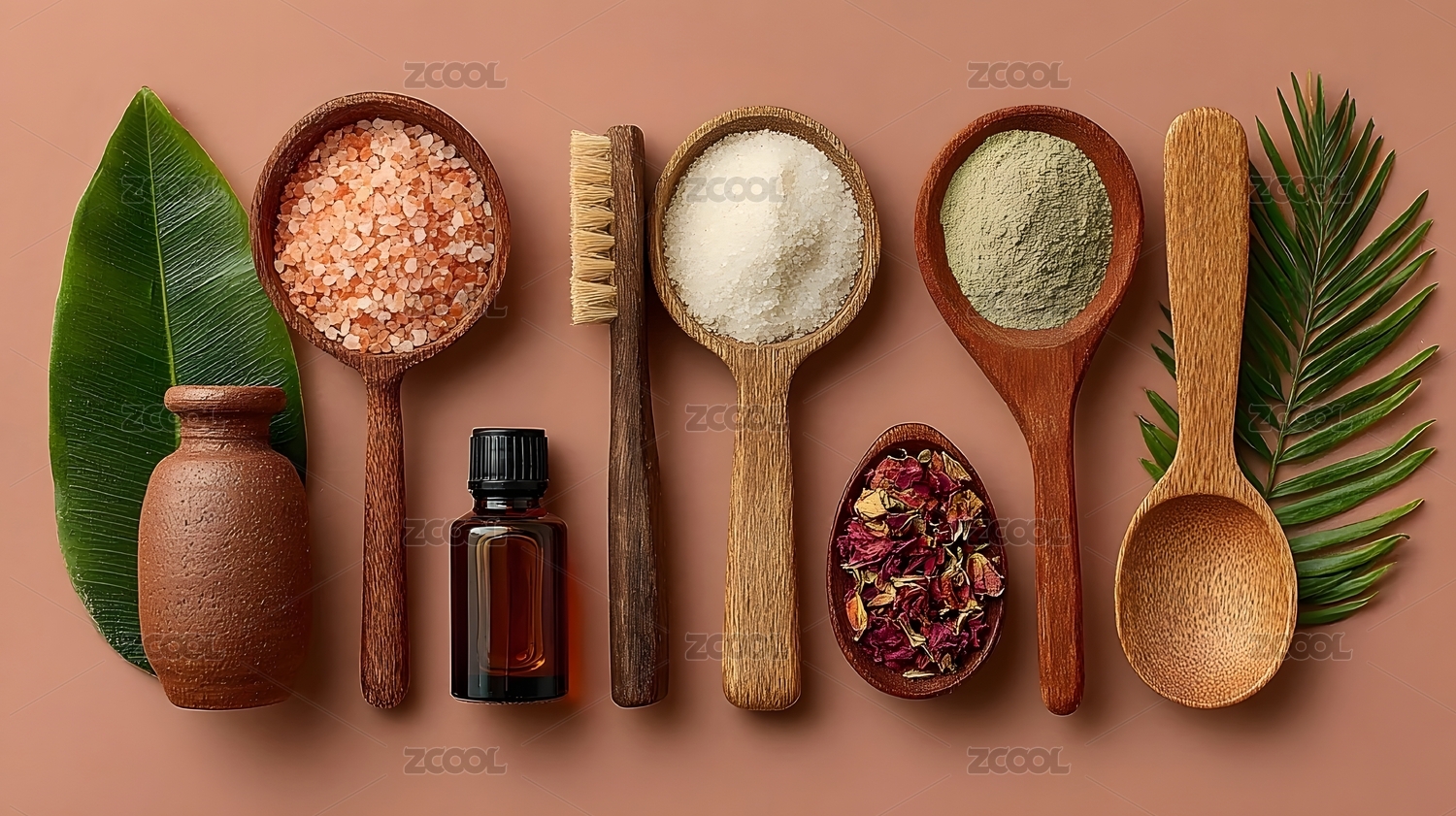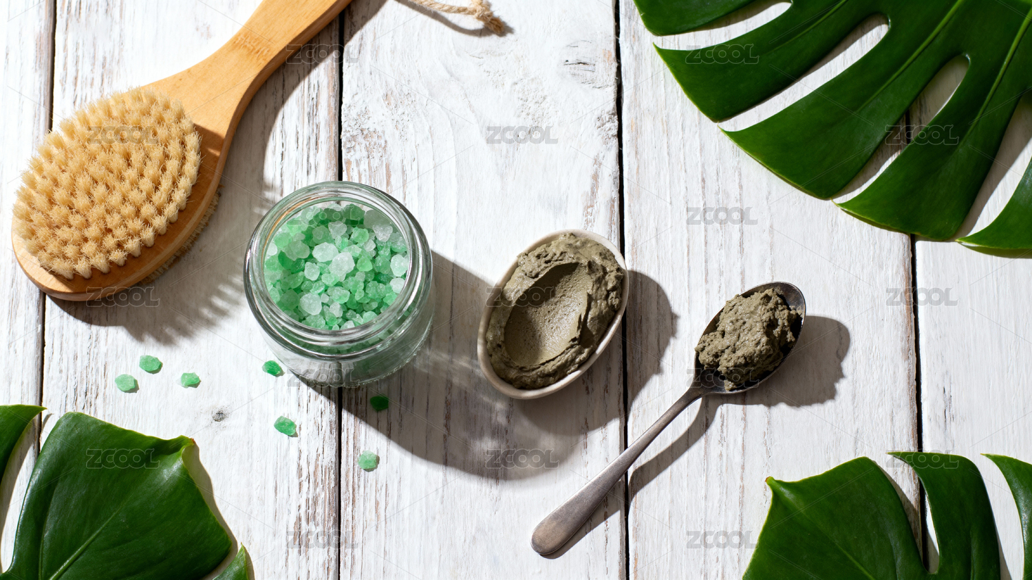 绿叶,白色,绿色,木勺,木板,颗粒,粉末,盐粒,表面,边缘