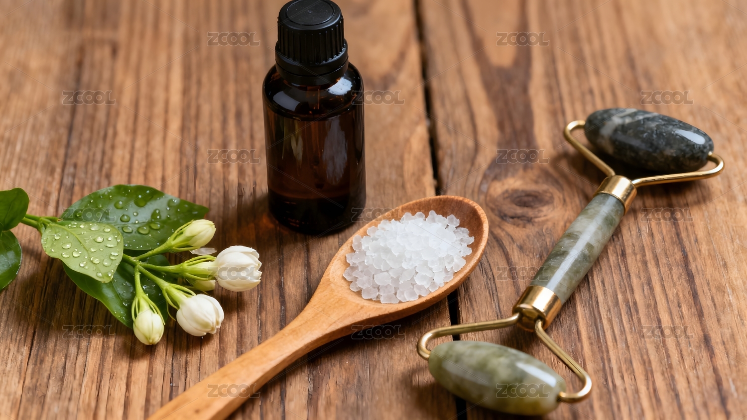 木质勺中盐粒与花瓶精油